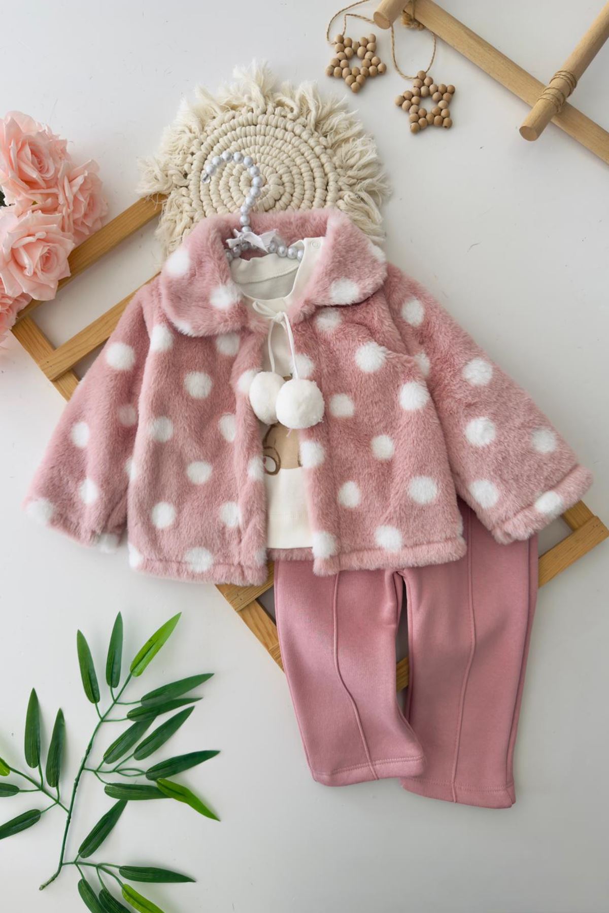 🌸 Miniğimin Cicileri Puantiye Desenli Kürklü Kız Bebek 3’lü Takım