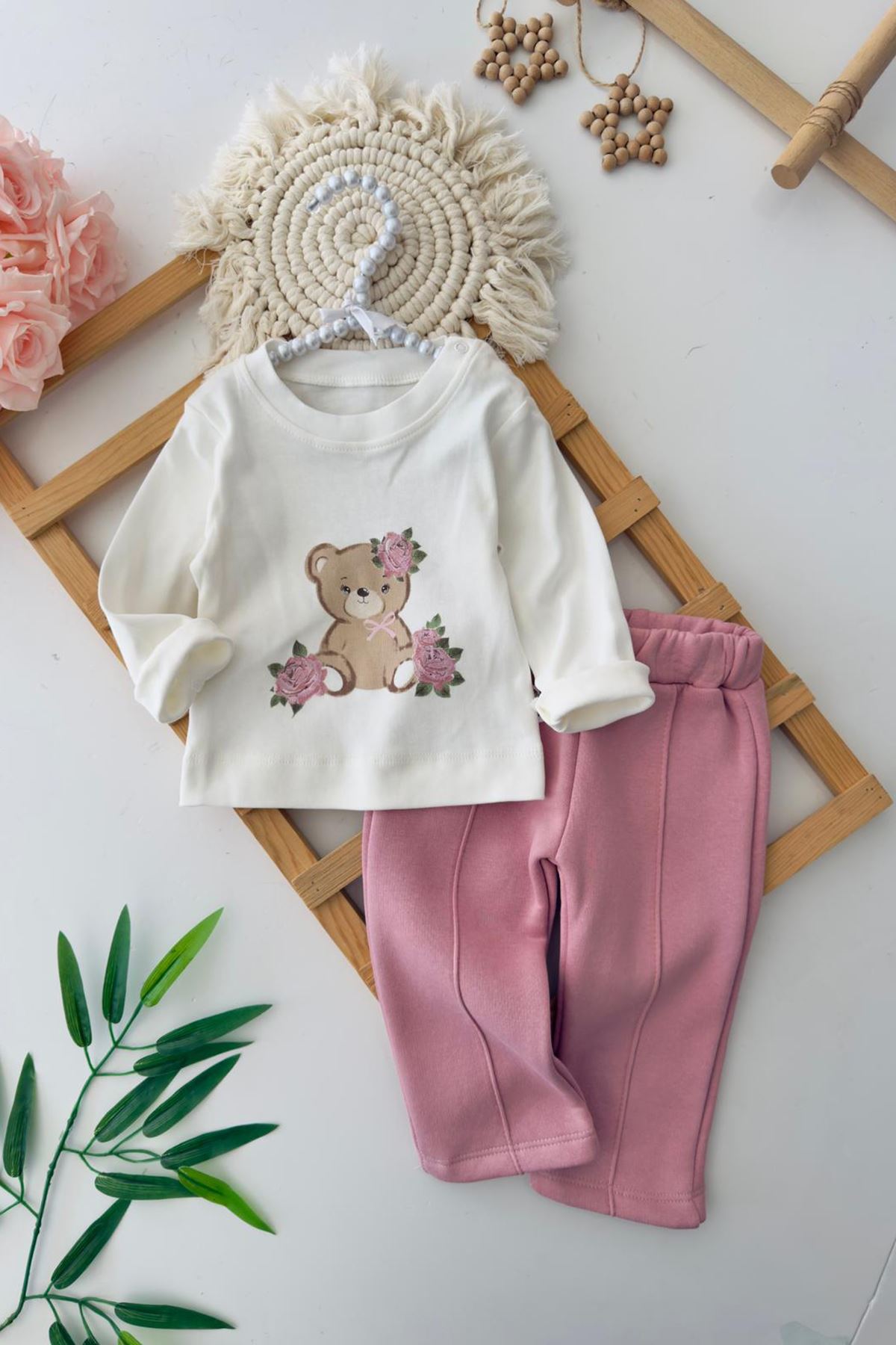 ✨ Ürün Özellikleri: 🧥 Puantiye desenli kürklü mont, yumuşacık dokusuyla soğuk havalarda bebeğinizi sıcacık tutar. 👕 Ayıcık baskılı uzun kollu tişört, takıma sevimli bir hava katar. 👖 Pembe pantolon, esnek yapısı ve lastikli bel detayıyla bebeğin hareket özgürlüğünü destekler. 🌿 Cilt dostu kumaşlardan üretilmiştir, bebeğinizin hassas tenine uygundur. ✔️ Üçlü parçalar ayrı ayrı da kullanılabilir, farklı kombinlerle kolayca uyum sağlar.