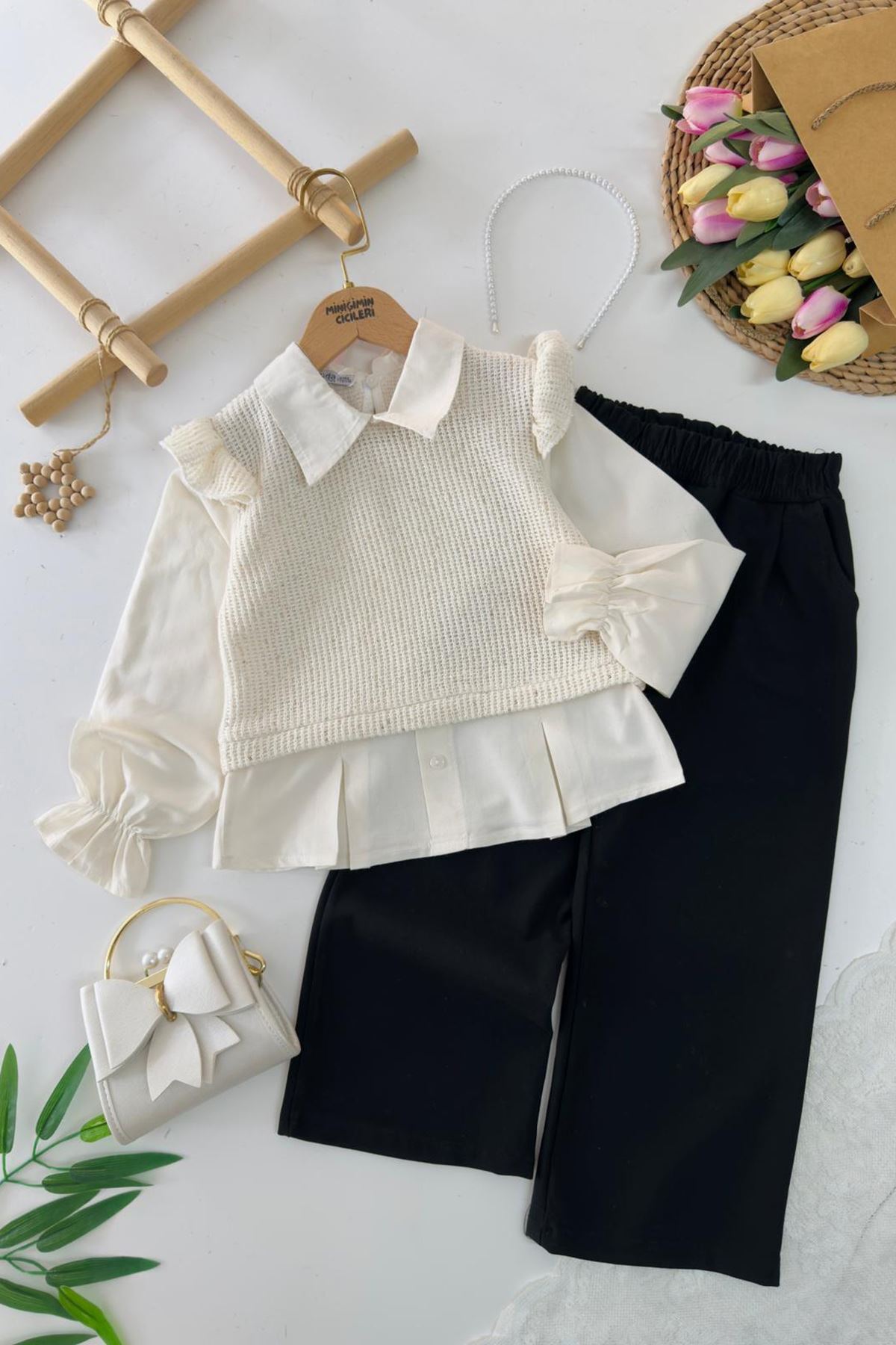 Hem zarif hem de modern bir stil arayan minikler için hazırlanan bu özel takım; pullu triko detaylı üst tasarımı ve rahat kesim alt parçasıyla günlük şıklığı pratik hale getirir.