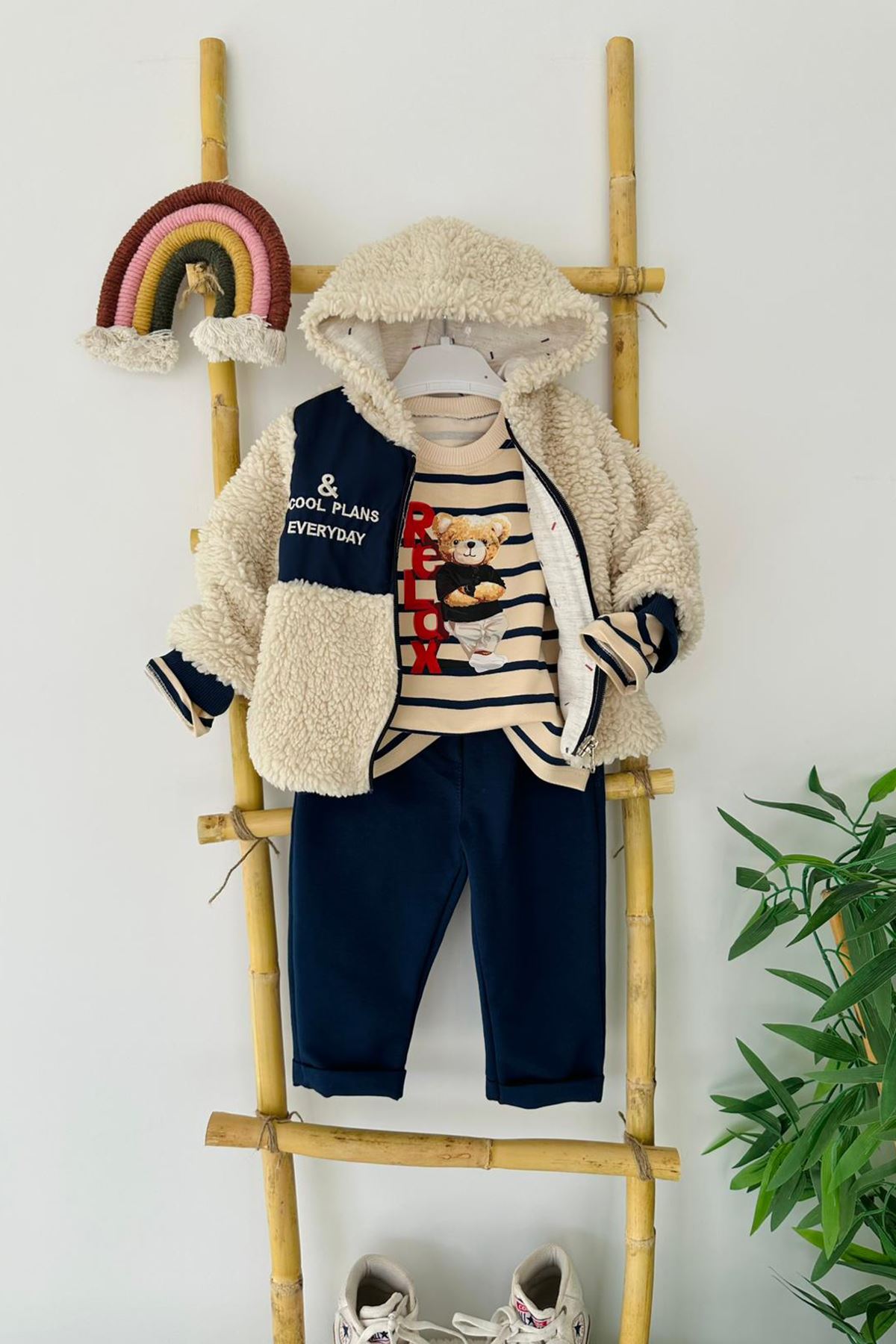 🌸 Miniğimin Cicileri Relax Ayıcık Baskılı Kuzu Montlu Erkek Bebek 3’lü Takım