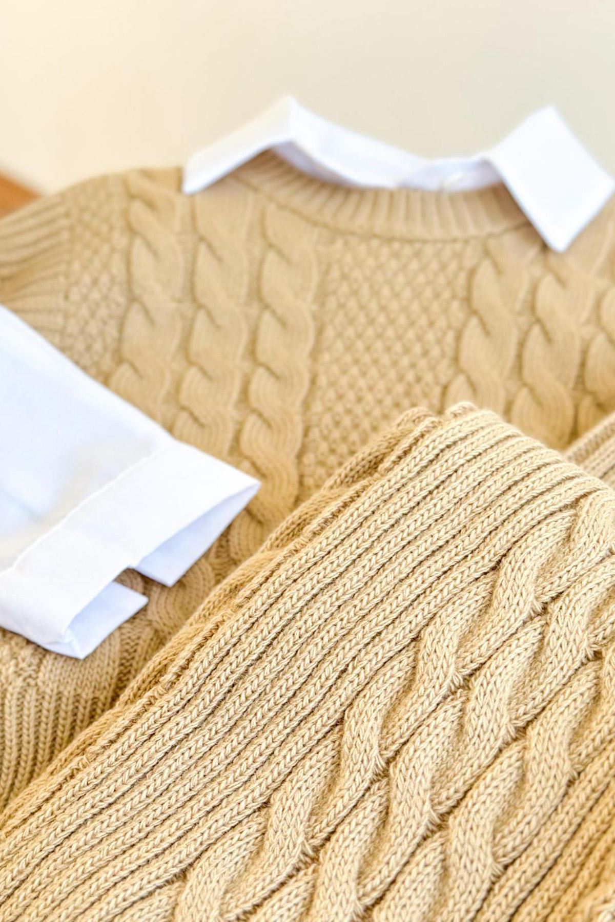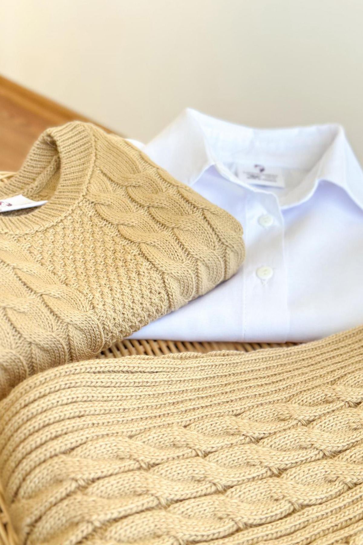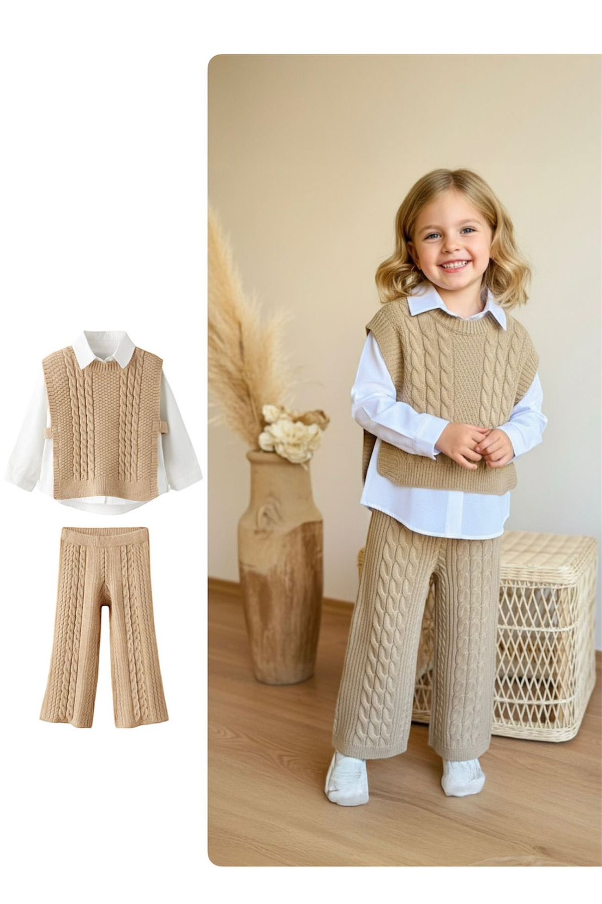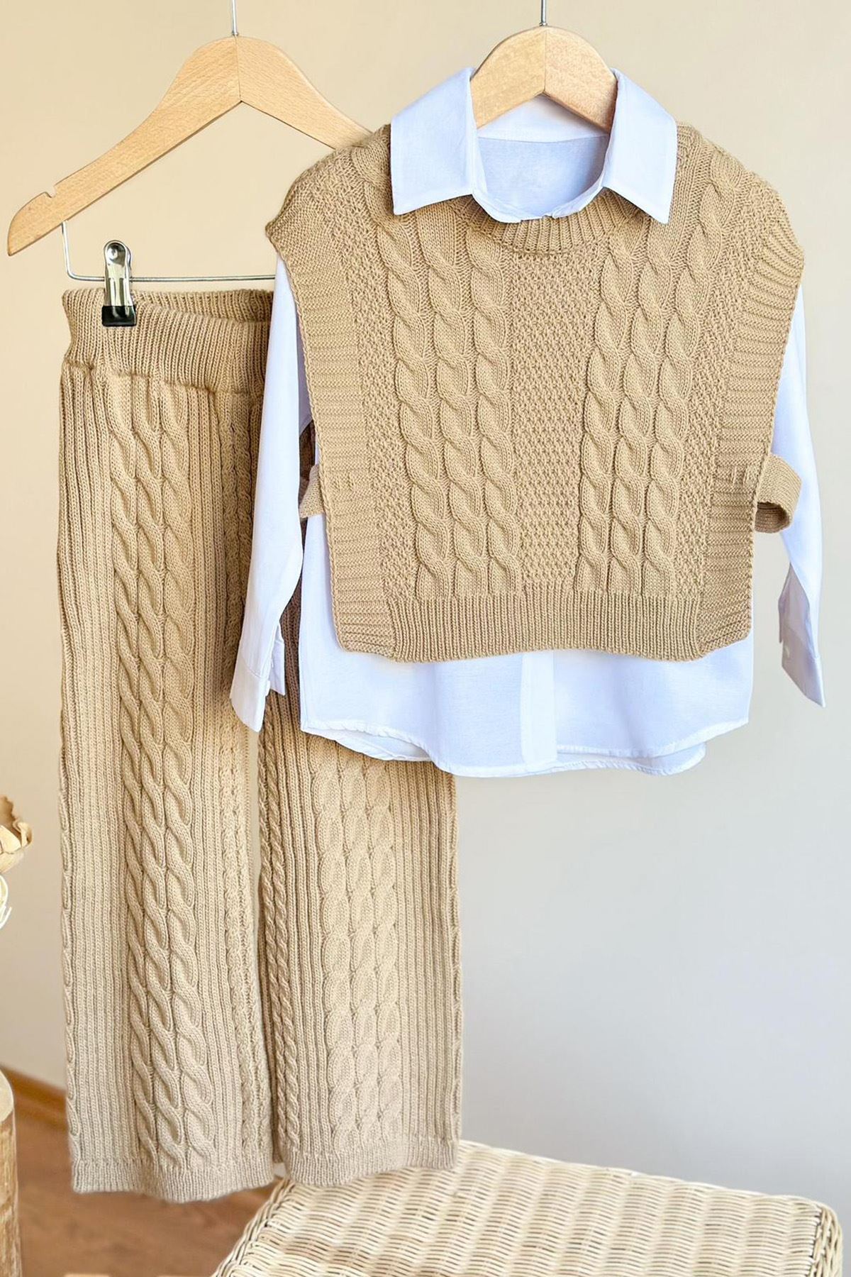 Miniğimin Cicileri Sarmal Çizgi Detaylı Gömlekli Bağlamalı 3'lü Triko Takım - Camel