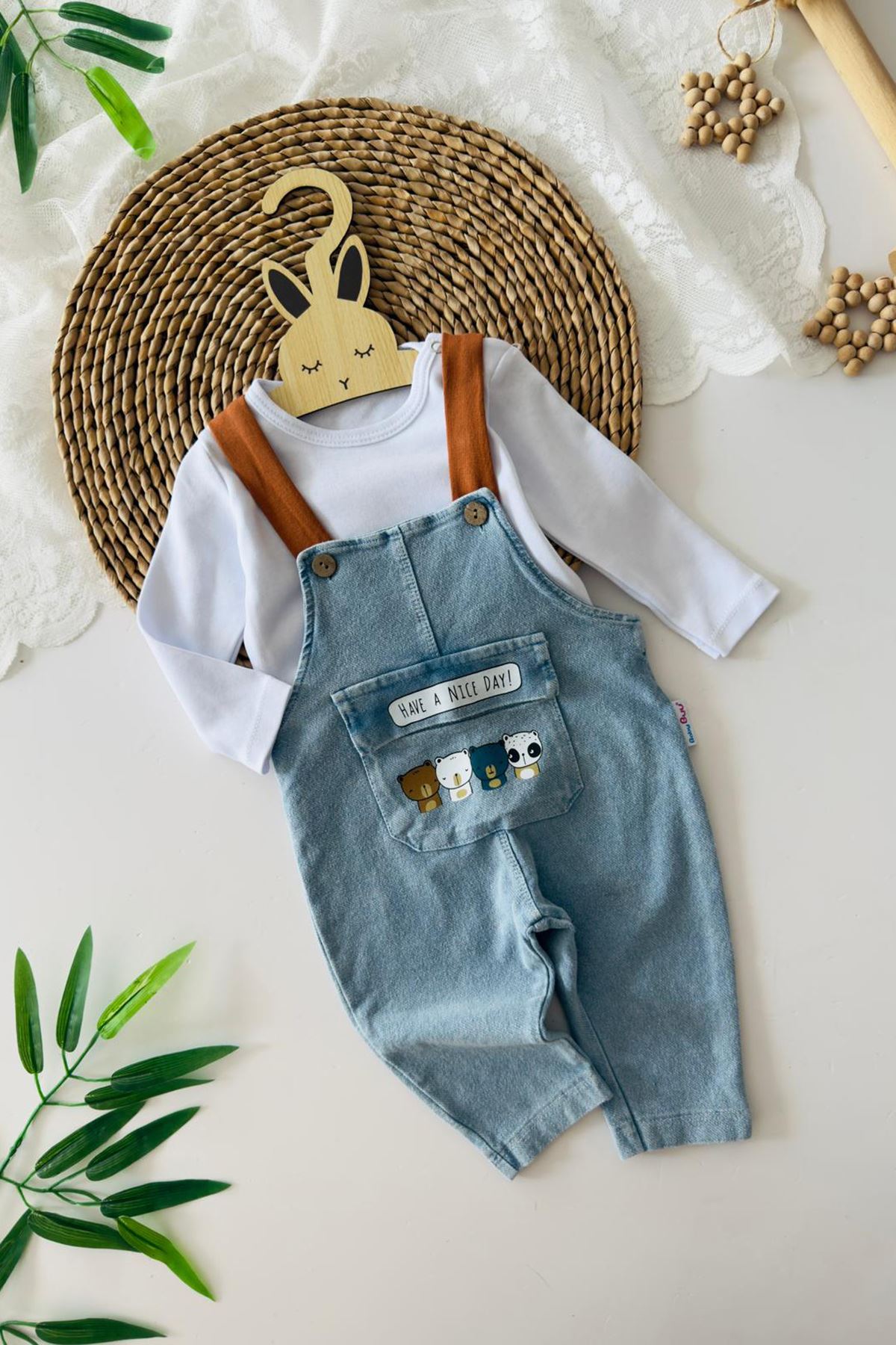 Günlük kullanıma uygun, pratik ve eğlenceli bir kombin arayan ebeveynler için ideal bir tercih. “Have a Nice Day!” mesajlı ön cep detayı ve sevimli hayvan figürleriyle bebeklerin enerjisine neşe katıyor.
