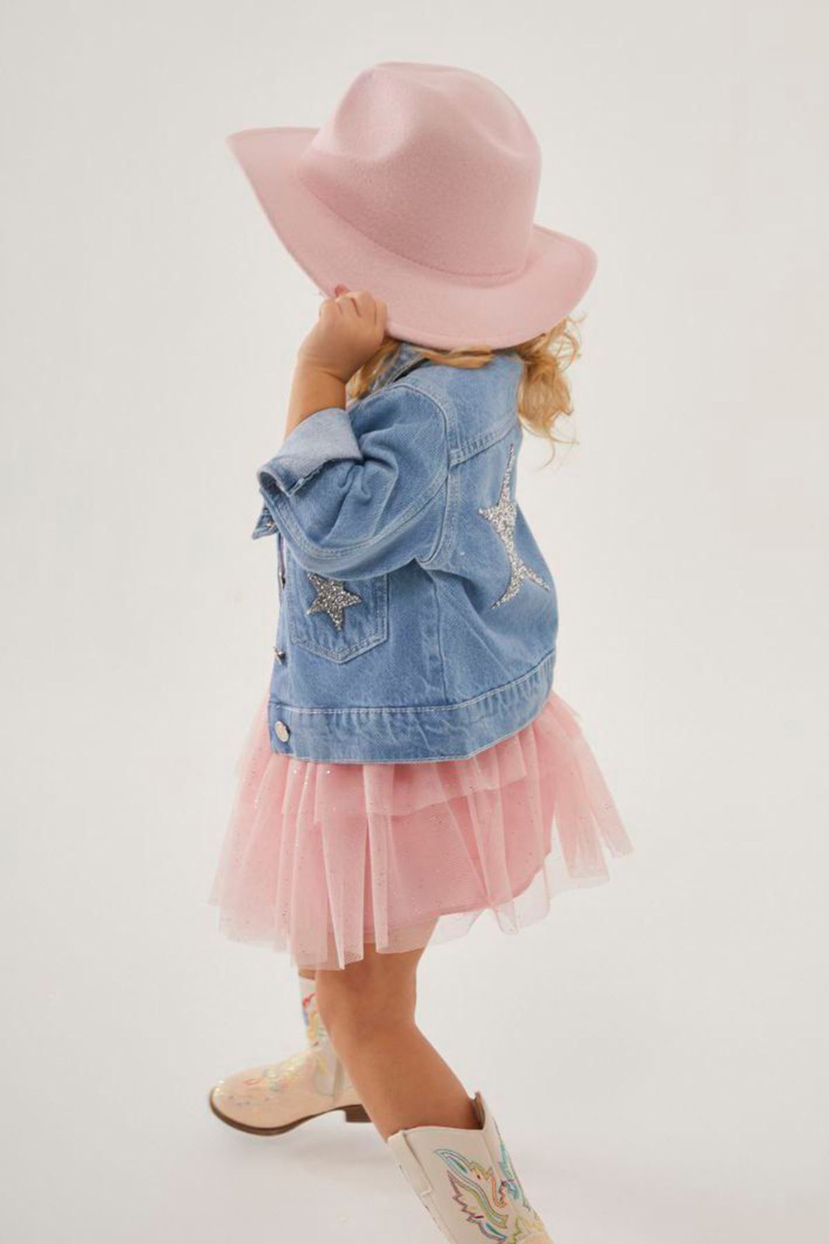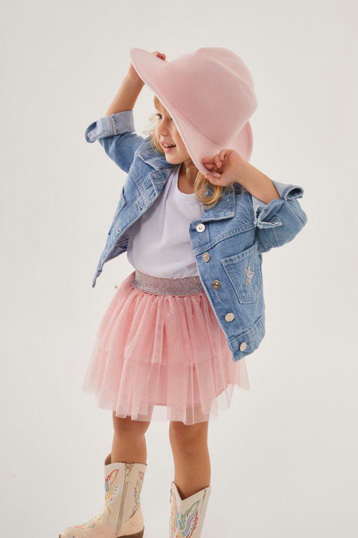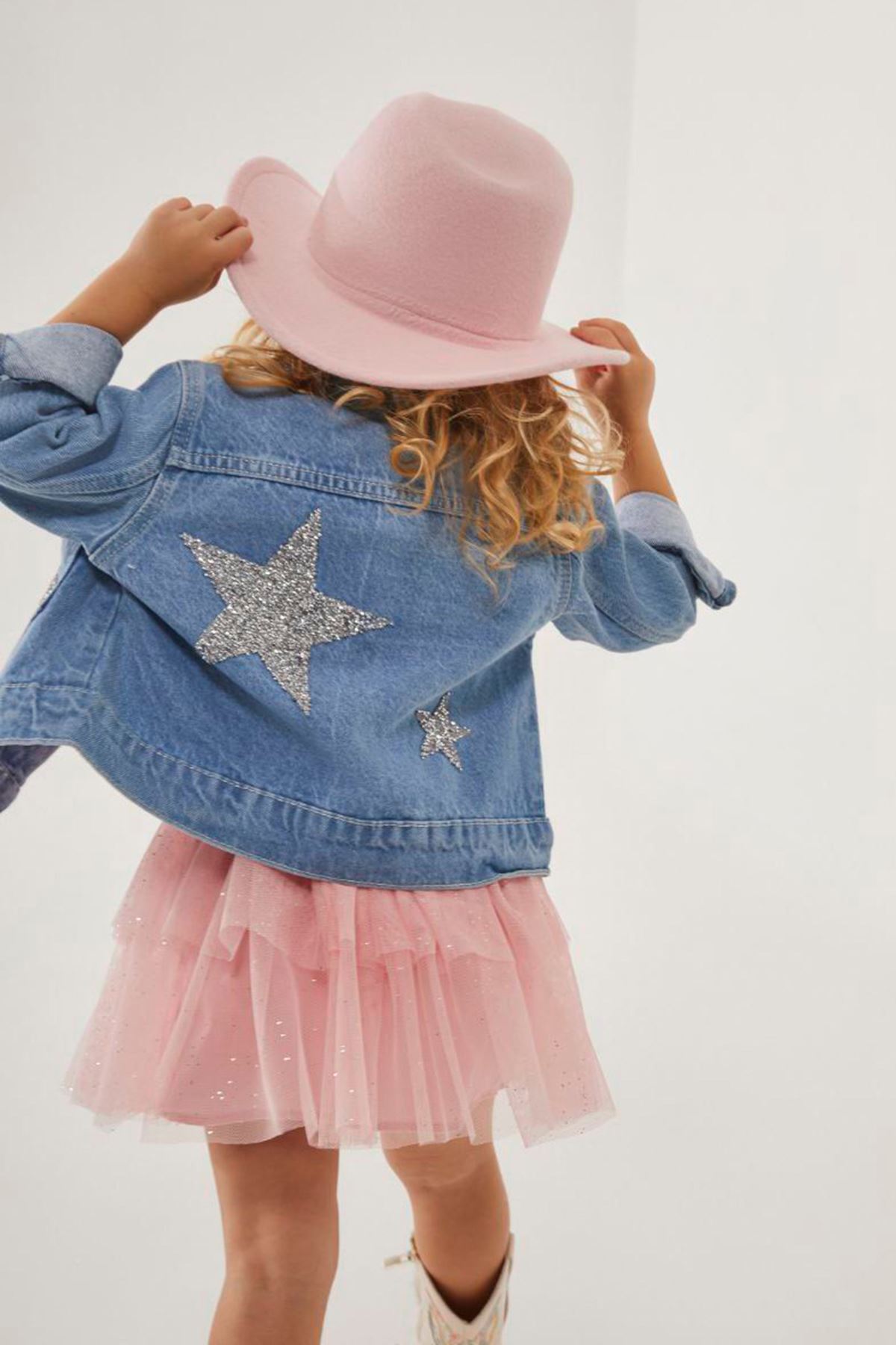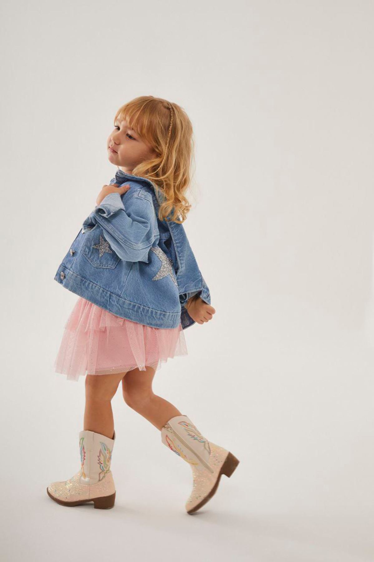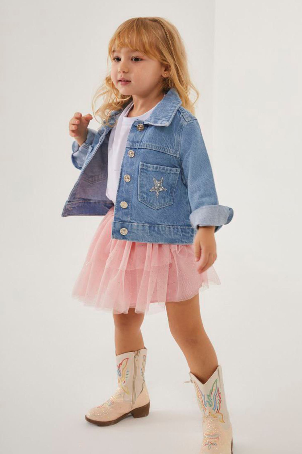 ✨ Ürün Özellikleri: 🧥 Simli yıldız işlemeli kot ceket, modern ve enerjik bir görünüm sunar. 🌟 Arka ve cep üzerindeki yıldız detayları, takıma ışıltılı bir dokunuş katar. 👗 Kat kat tütü etek, yumuşak tül yapısıyla kabarık ve zarif bir duruş sağlar. 🎀 2’li takım; ceket ve etekten oluşur, kolay kombinlenebilir yapıdadır. 🧵 Rahat kesim ve kaliteli kumaş, gün boyu konfor ve hareket özgürlüğü sunar.