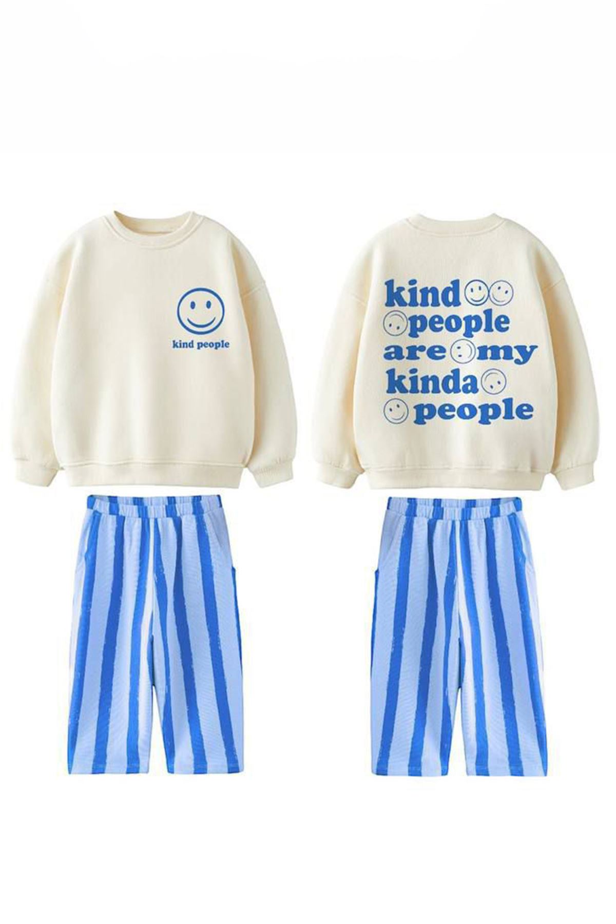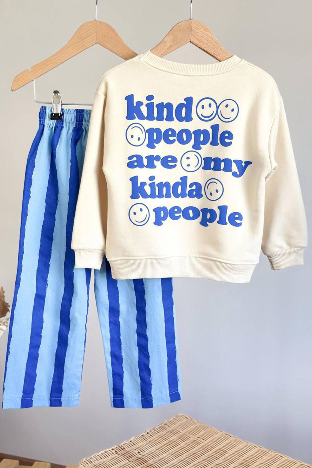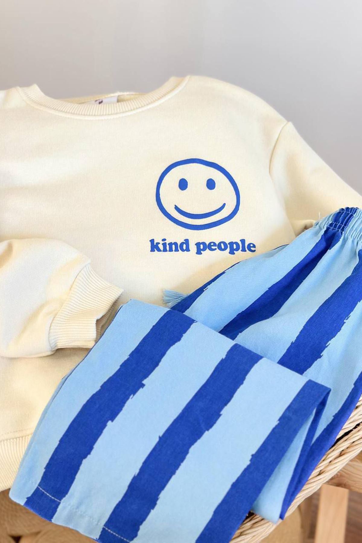 ✨ Ürün Özellikleri: 👕 Uzun kollu sweatshirt, ön kısmında gülen yüz detayı ve “kind people” yazısı, arkasında ise eğlenceli baskısıyla modern bir stil sunar. 👖 Çizgili pantolon, rahat kesimiyle gün boyu özgürce hareket etme imkanı sağlar. 🌿 Yumuşak ve esnek kumaş yapısı sayesinde hassas ciltlere uyumludur. 📌 Unisex tasarımı ile hem kız hem erkek çocuklar için kullanılabilir. ✔️ Parçalar ayrı ayrı kombinlenerek farklı tarzlara kolayca uyum sağlar.