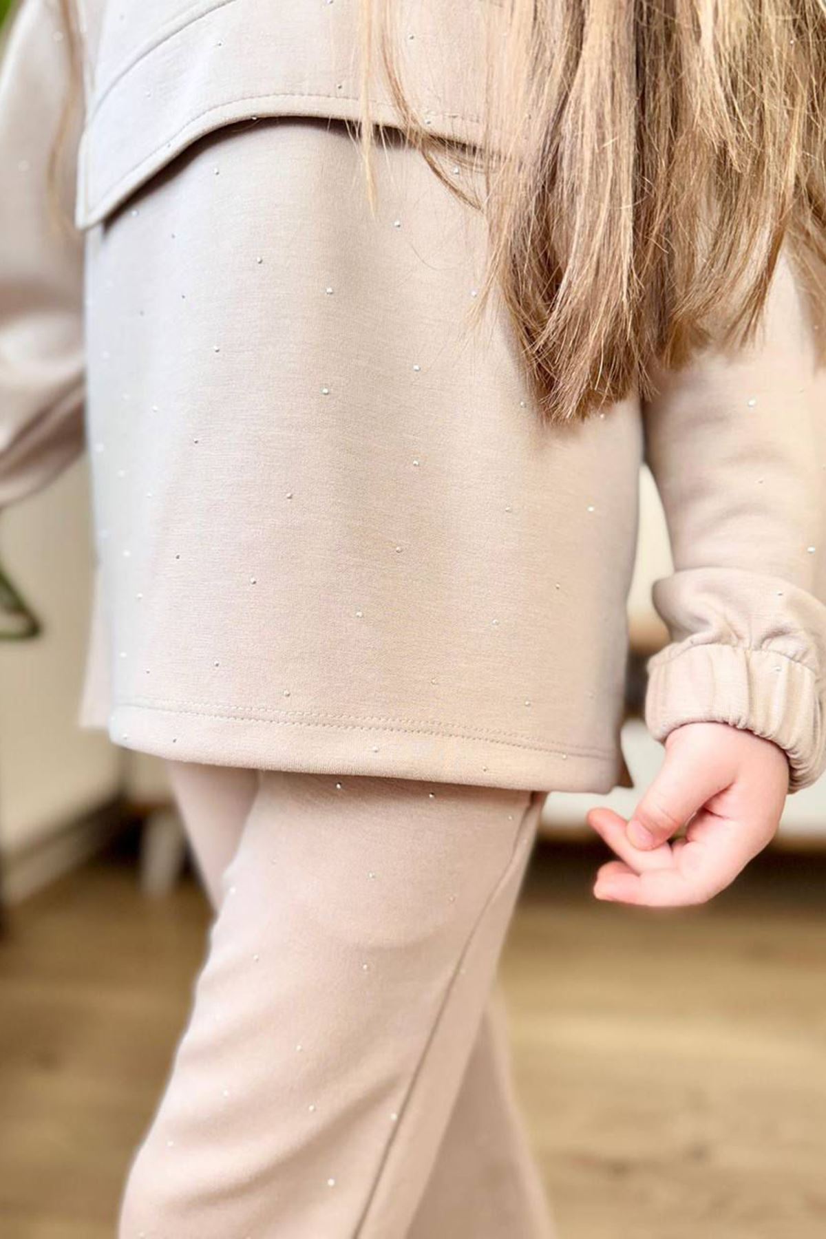 Miniğimin Cicileri Taş İşlemeli Kapüşonlu Kız Çocuk Takım - Krem