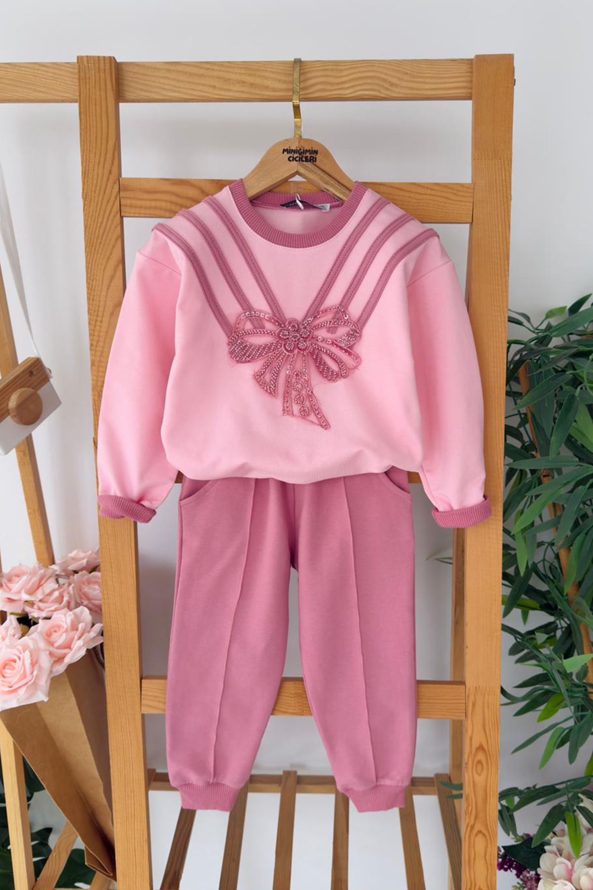 Parıltılı taşlı fiyonk detayıyla hem şirin hem zarif bir görünüm sunan konforlu takım.