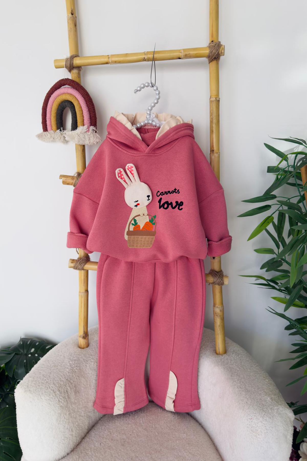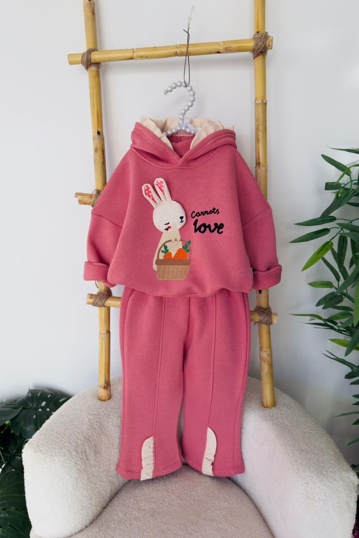 Sıcacık kumaşı, tatlı tavşan motifi ve rahat kesimiyle bu takım, kız bebeklerin soğuk havalarda hem şirin hem konforlu görünmesini sağlar. Kışa neşe katan sevimli bir tercih! 🐰💫