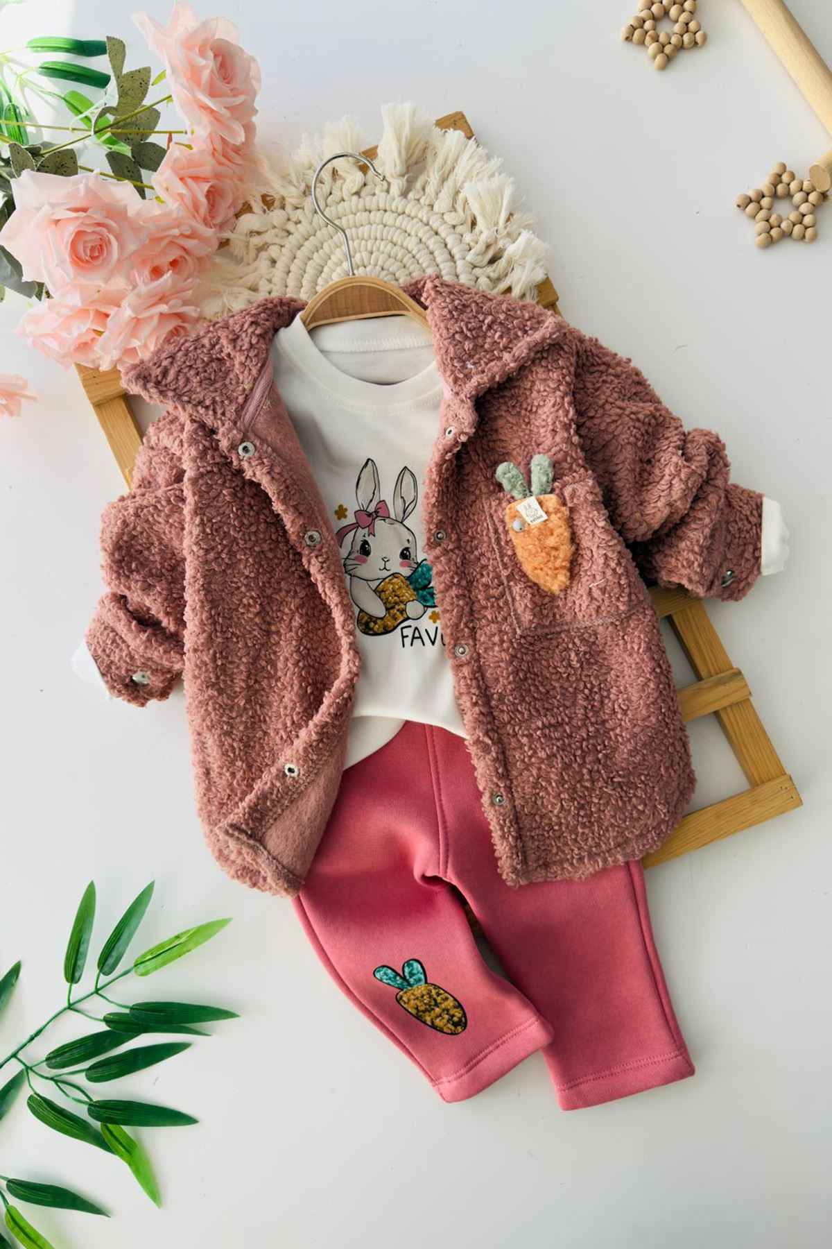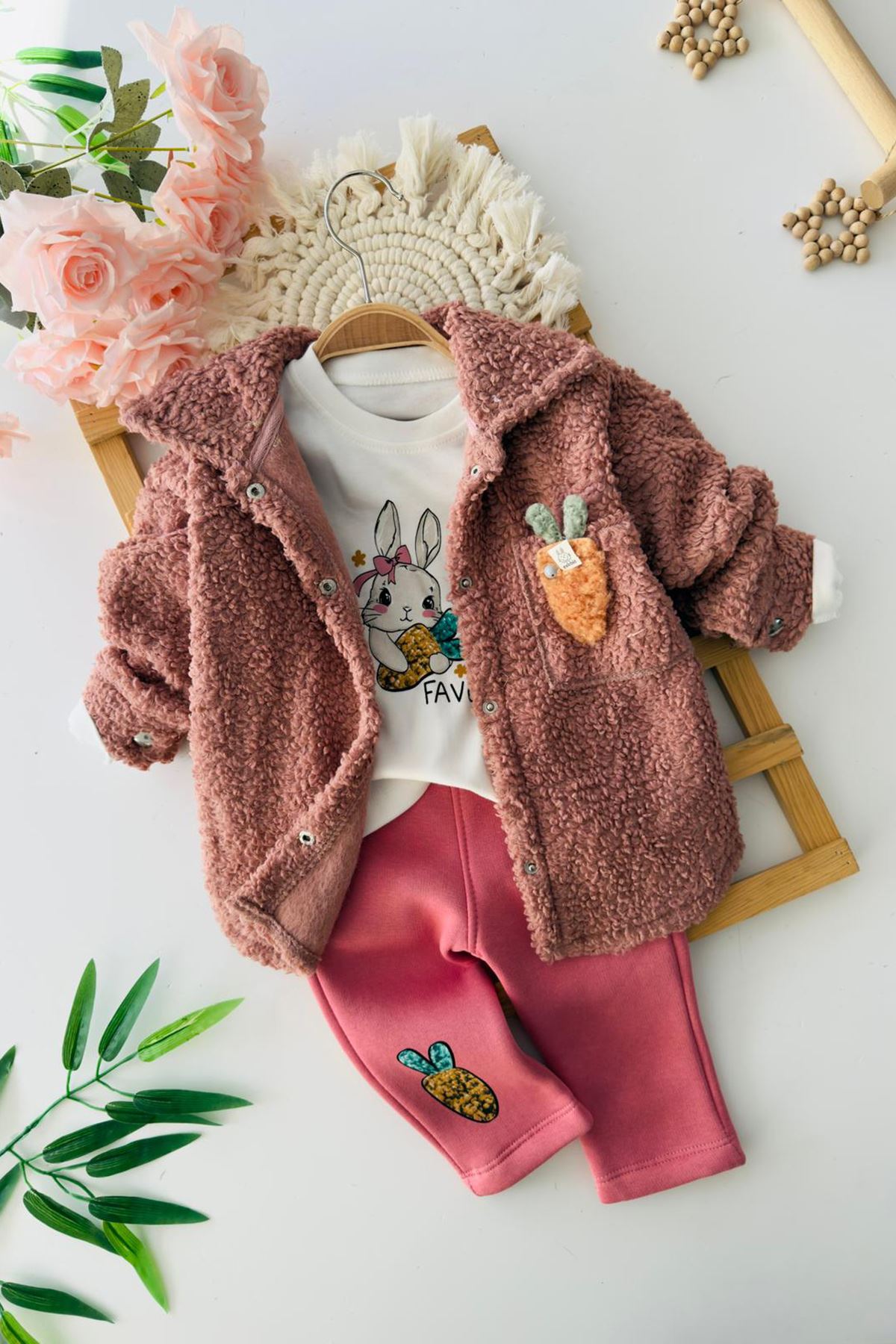 🔖 Miniğimin Cicileri Tavşan Detaylı Kürklü Ceketli Kız Bebe 3’lü Kışlık Takım