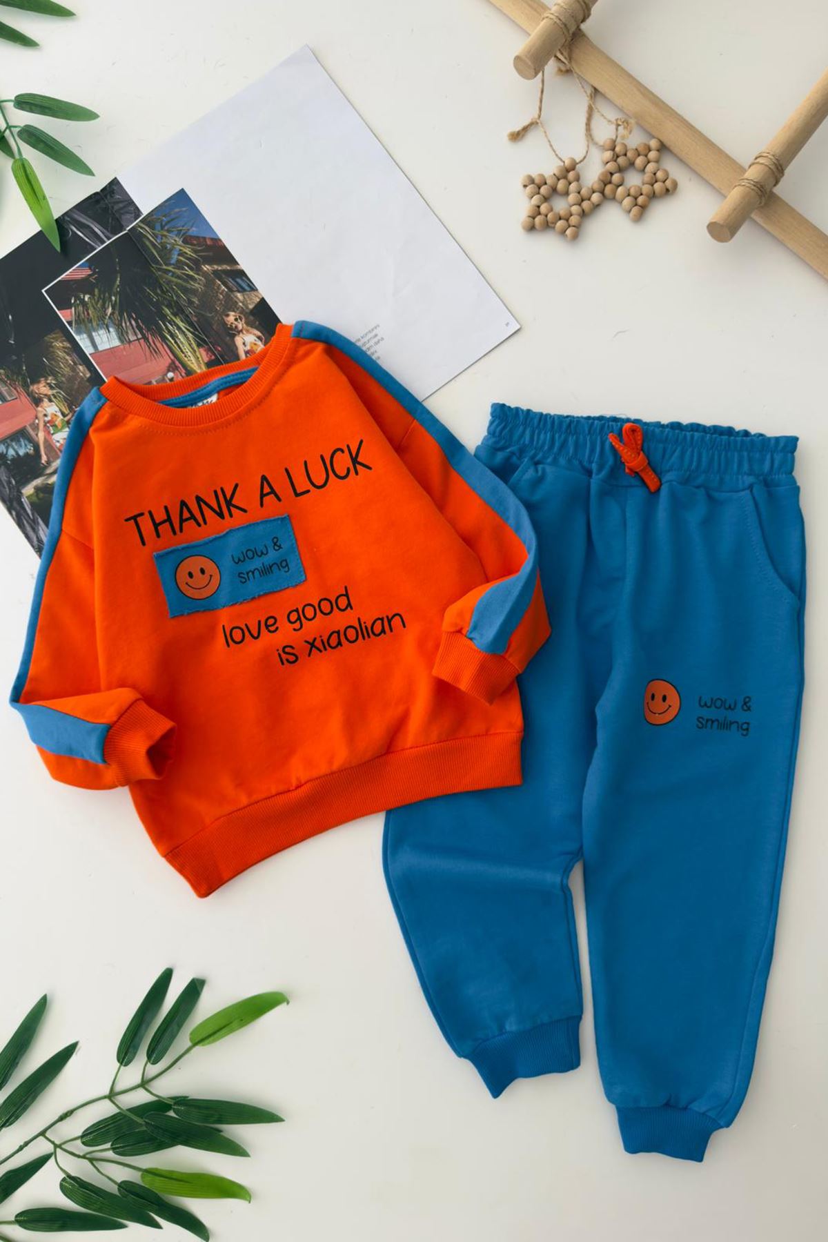 ✨ Ürün Özellikleri: ✔️ Üzerinde “Thank A Luck” yazılı baskı ve smiley detayları ile enerjik bir stil sunar. ✔️ Turuncu üst ve mavi alt kombinasyonu, dikkat çekici ve modern bir görünüm sağlar. ✔️ Rahat kesim ve lastikli bel yapısı ile çocukların hareket özgürlüğünü destekler. ✔️ Günlük kullanım, okul ve oyun zamanı için son derece uygundur. ✔️ Şık şerit detaylarıyla spor şıklık sunar.