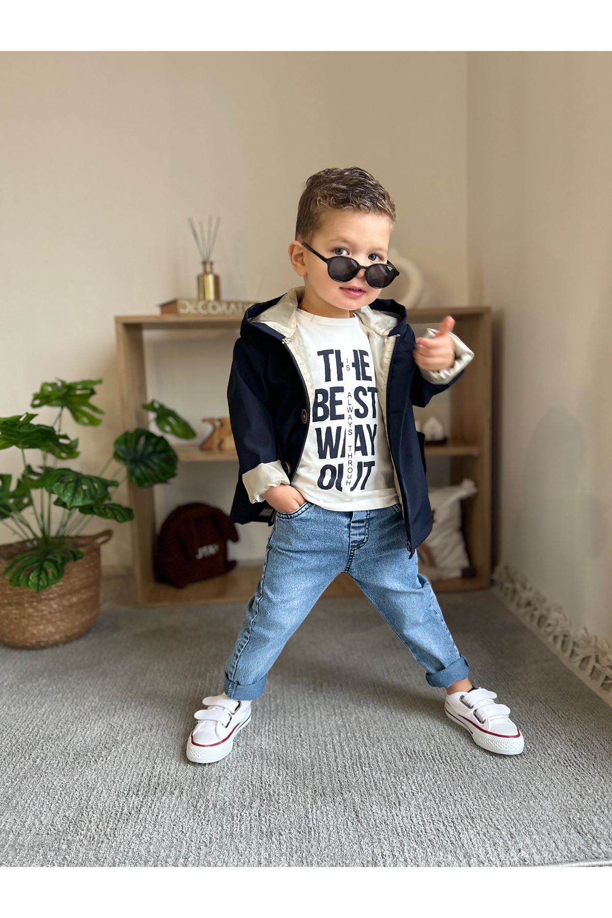 • Takım İçeriği: Şık trençkot, baskılı tişört ve jean pantolondan oluşan 3'lü set.