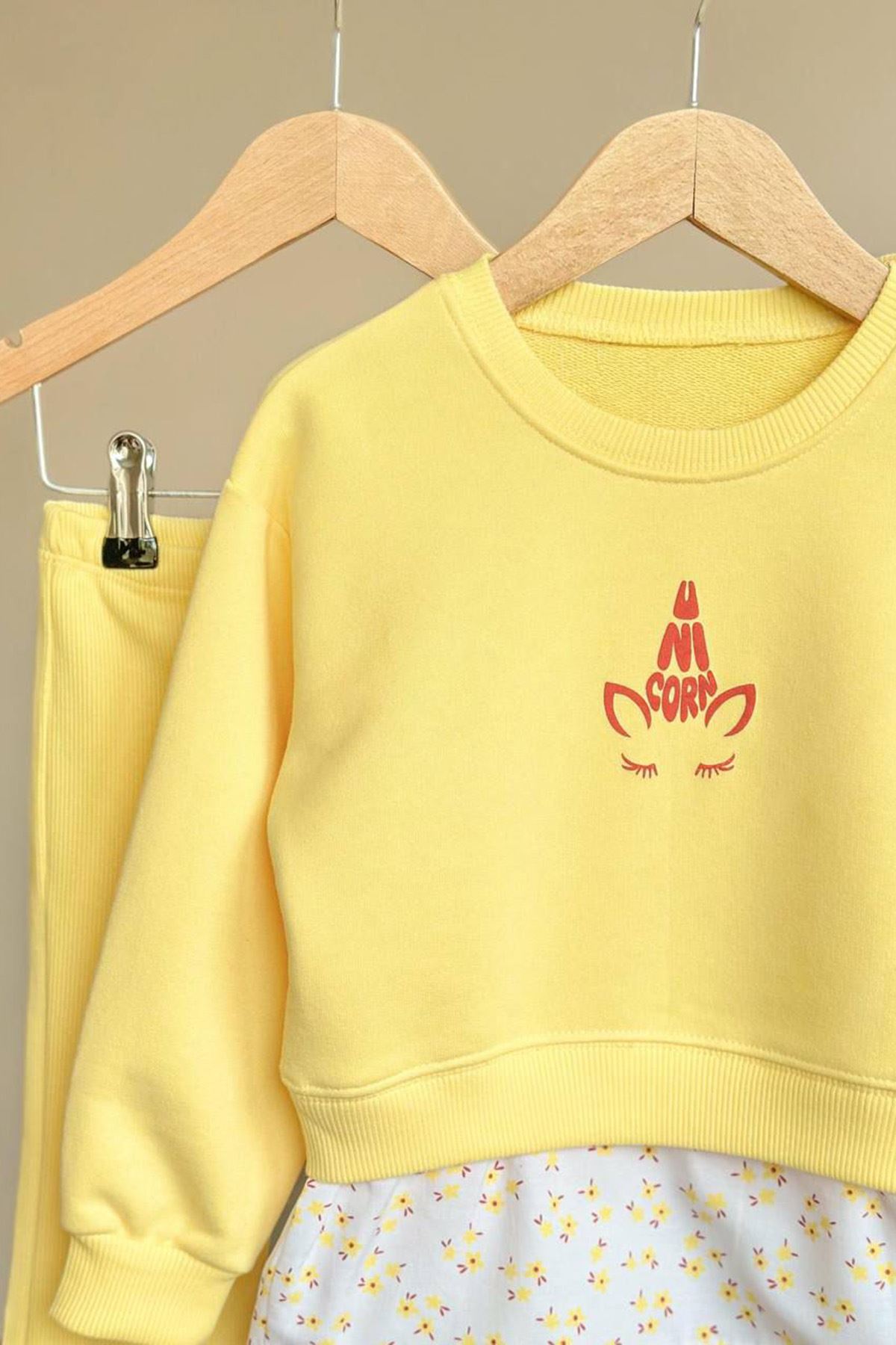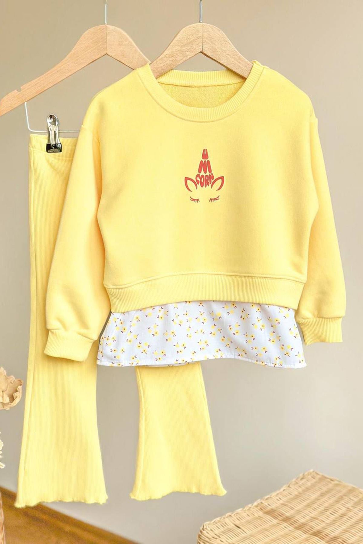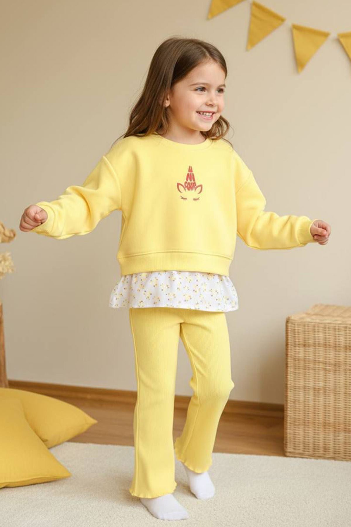 👗 Ürün Özellikleri: 💛 Üst kısmında yer alan unicorn baskı, tatlı ve eğlenceli bir görünüm sunar. 🌸 Alt kısmındaki çiçek desenli detay, tasarıma zarif bir dokunuş katar. 👖 Esnek yapılı pantolon, hareket özgürlüğü sağlar ve gün boyu konfor sunar. 🌿 Yumuşak dokulu kumaşıyla cilt dostudur, mevsim geçişleri için idealdir. 🎀 Günlük kullanımda veya minik davetlerde rahatlıkla tercih edilebilir.