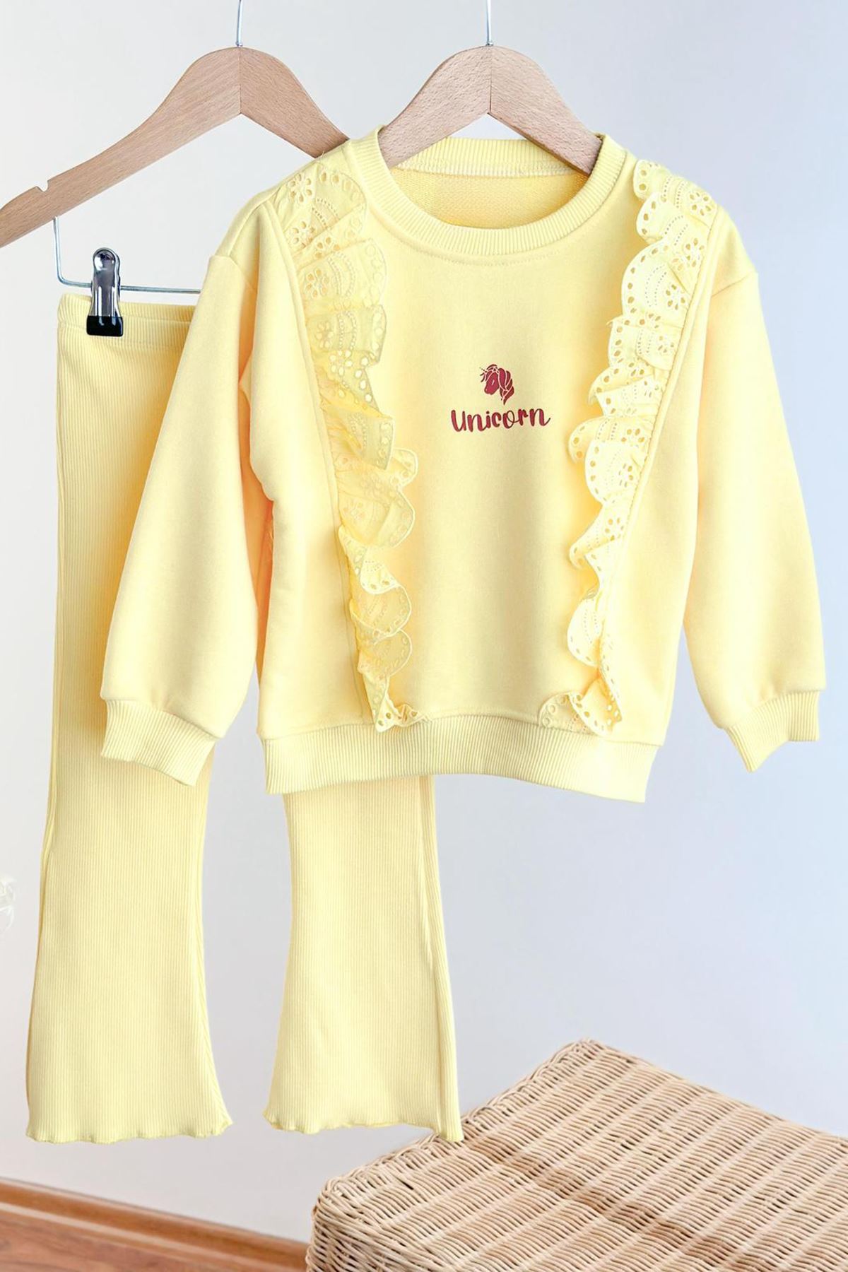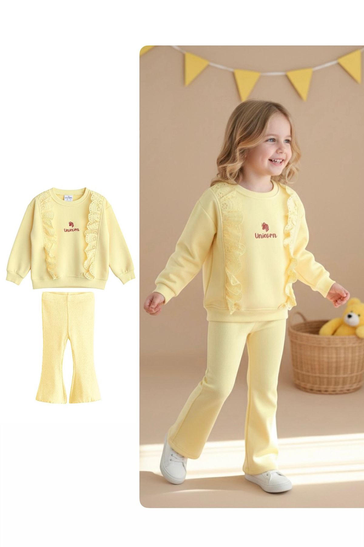 Zarif fisto detayları ve unicorn temasıyla hem şık hem rahat bir kombin sunan bu takım, minik prenseslerin favorisi olmaya aday!