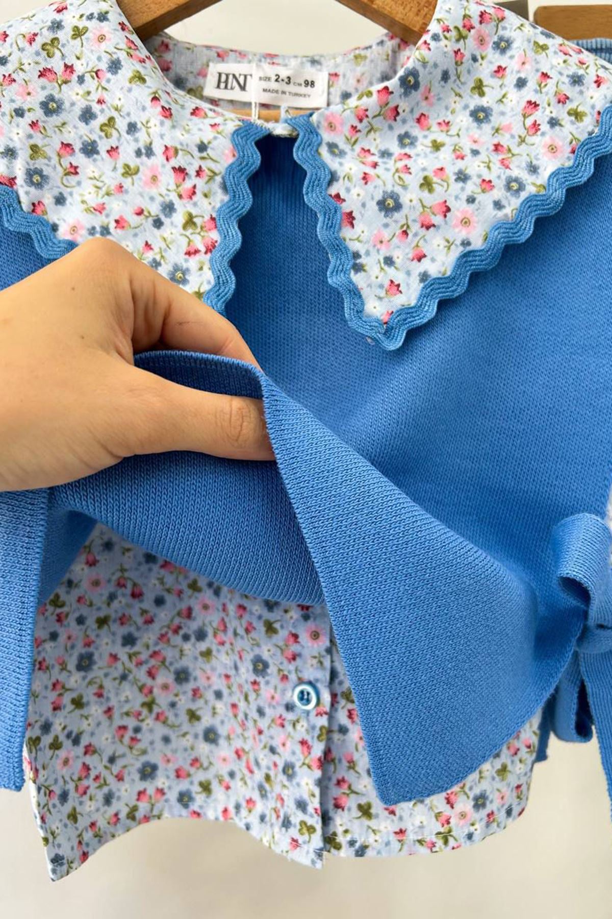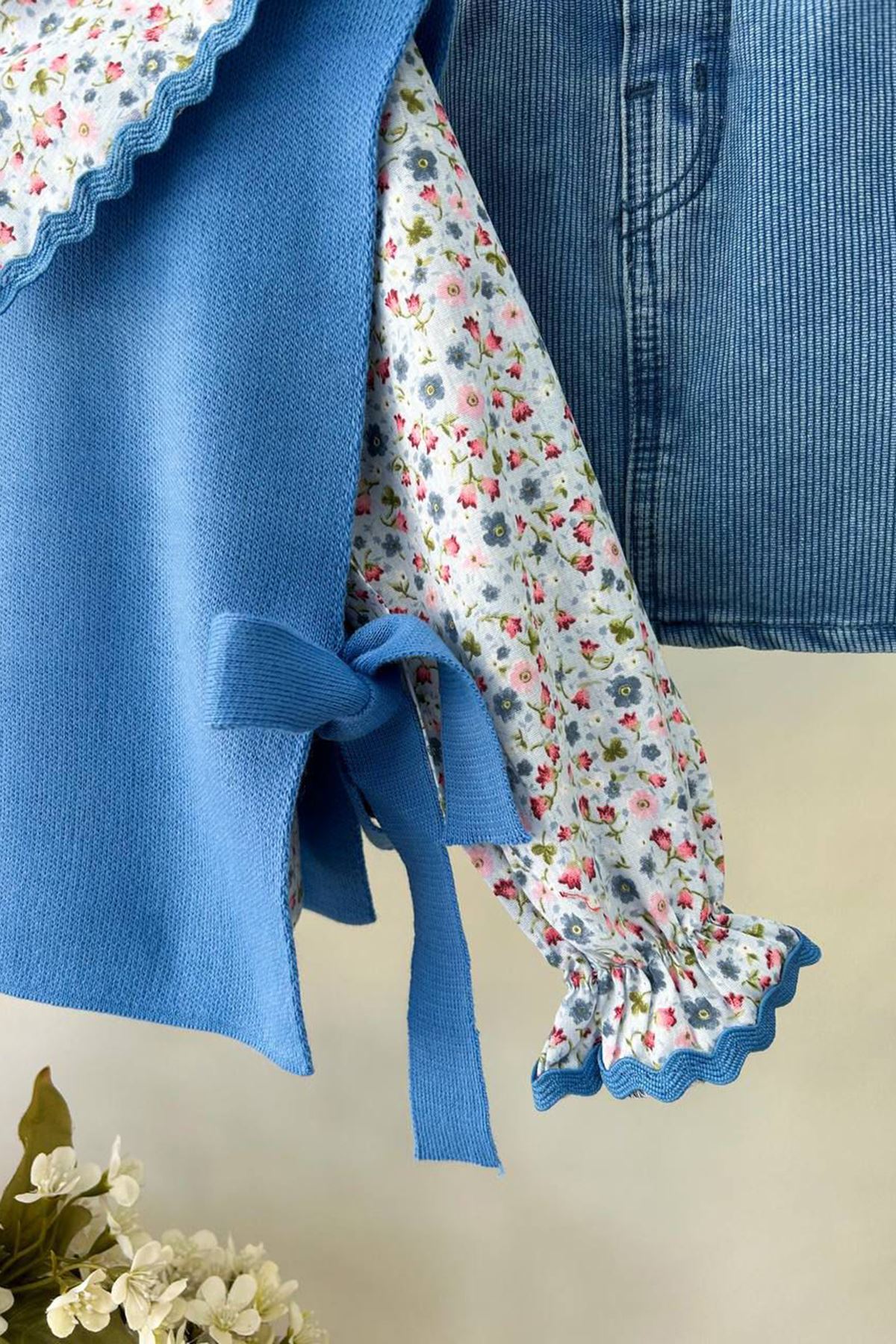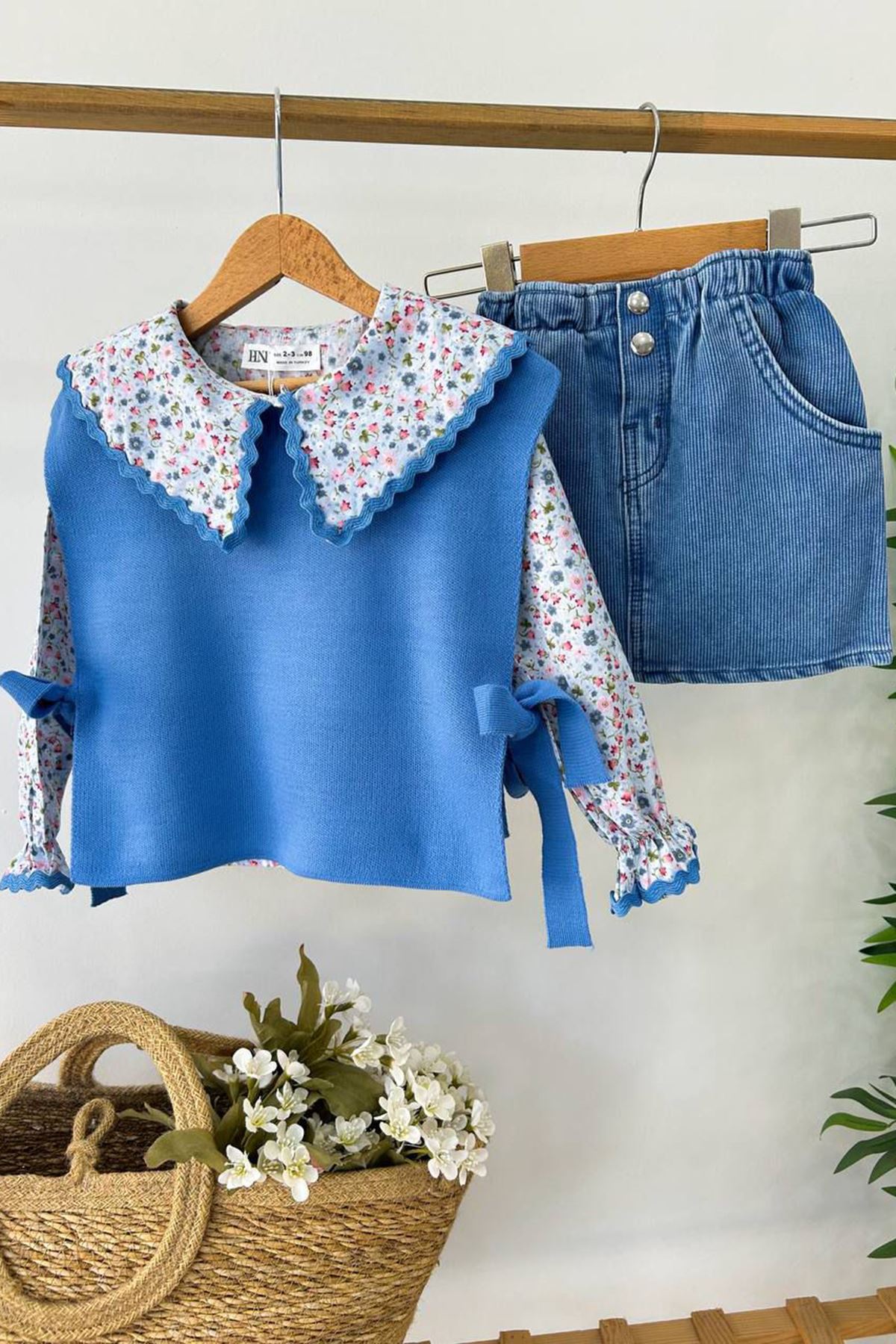 ✨ Ürün Özellikleri: 👕 Çiçek desenli yakalı triko üst, hareketli tasarımıyla dikkat çeker. 🎀 Kollardaki fiyonk detayları, takıma sevimli bir dokunuş kazandırır. 👗 Kot etek, esnek bel yapısı sayesinde rahat kullanım sağlar ve modern bir görünüm sunar. 🧶 Triko kumaş üst, yumuşak dokusuyla konforlu bir deneyim sağlar. 🌸 Üst ve etek parçaları ayrı ayrı da kombinlenebilir, çok yönlü kullanım imkânı sunar.