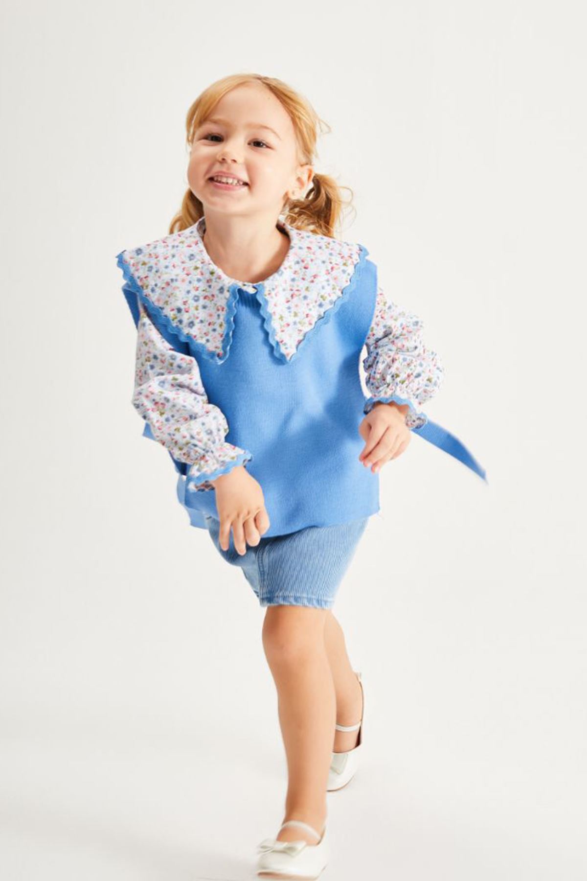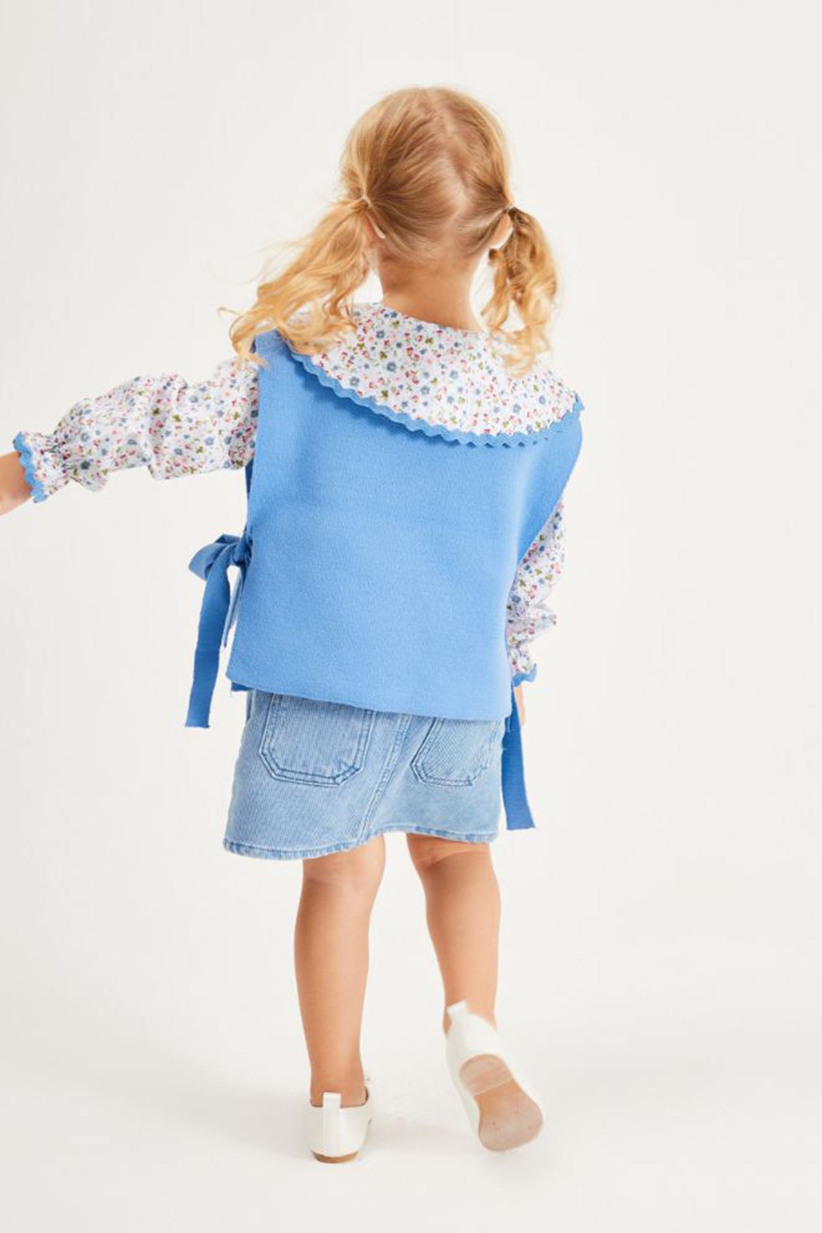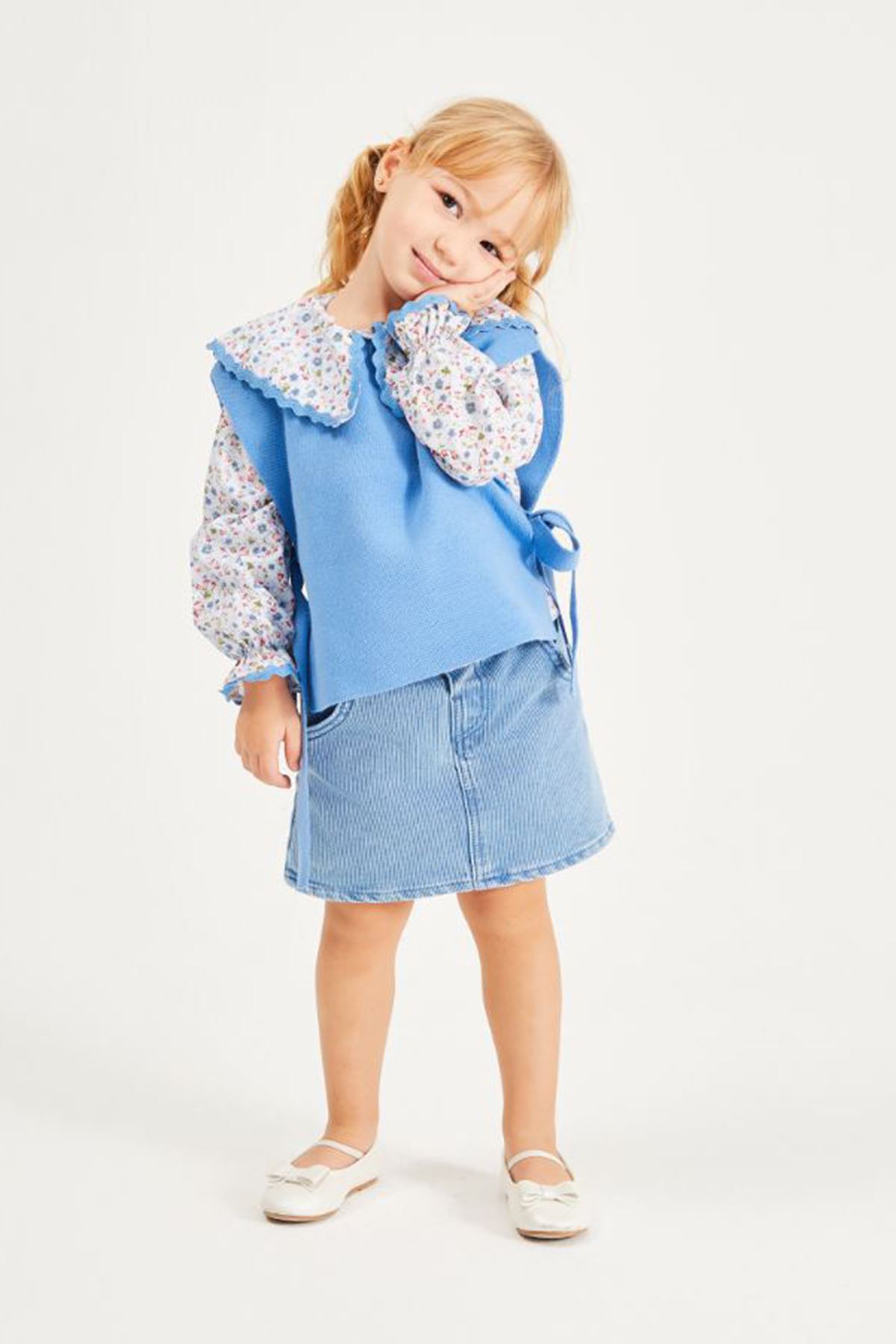 ✨ Ürün Özellikleri: 👕 Çiçek desenli yakalı triko üst, hareketli tasarımıyla dikkat çeker. 🎀 Kollardaki fiyonk detayları, takıma sevimli bir dokunuş kazandırır. 👗 Kot etek, esnek bel yapısı sayesinde rahat kullanım sağlar ve modern bir görünüm sunar. 🧶 Triko kumaş üst, yumuşak dokusuyla konforlu bir deneyim sağlar. 🌸 Üst ve etek parçaları ayrı ayrı da kombinlenebilir, çok yönlü kullanım imkânı sunar.