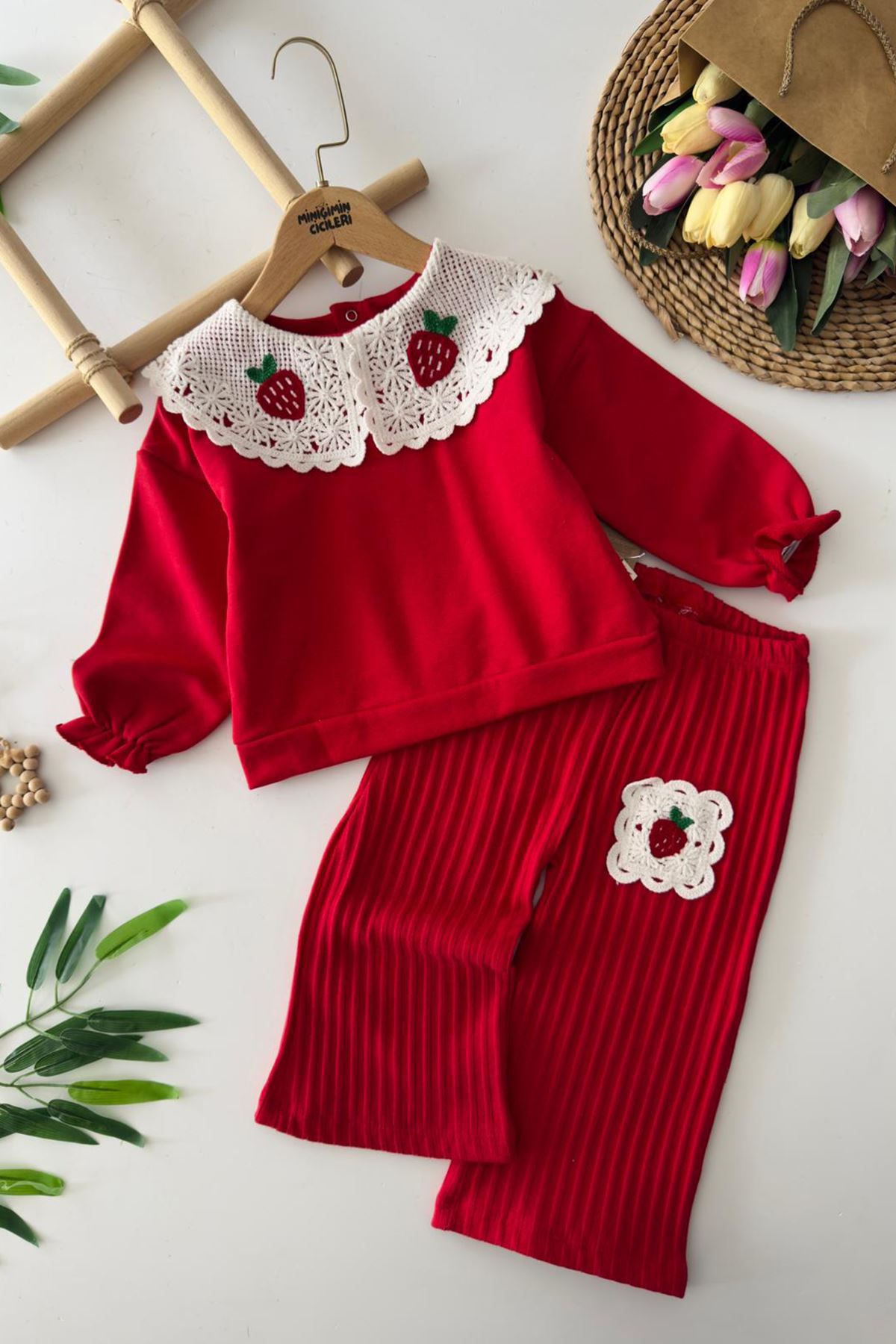 🌸 Miniğimin Cicileri Yaka Dantel Çilek Detaylı Kız Çocuk Takım