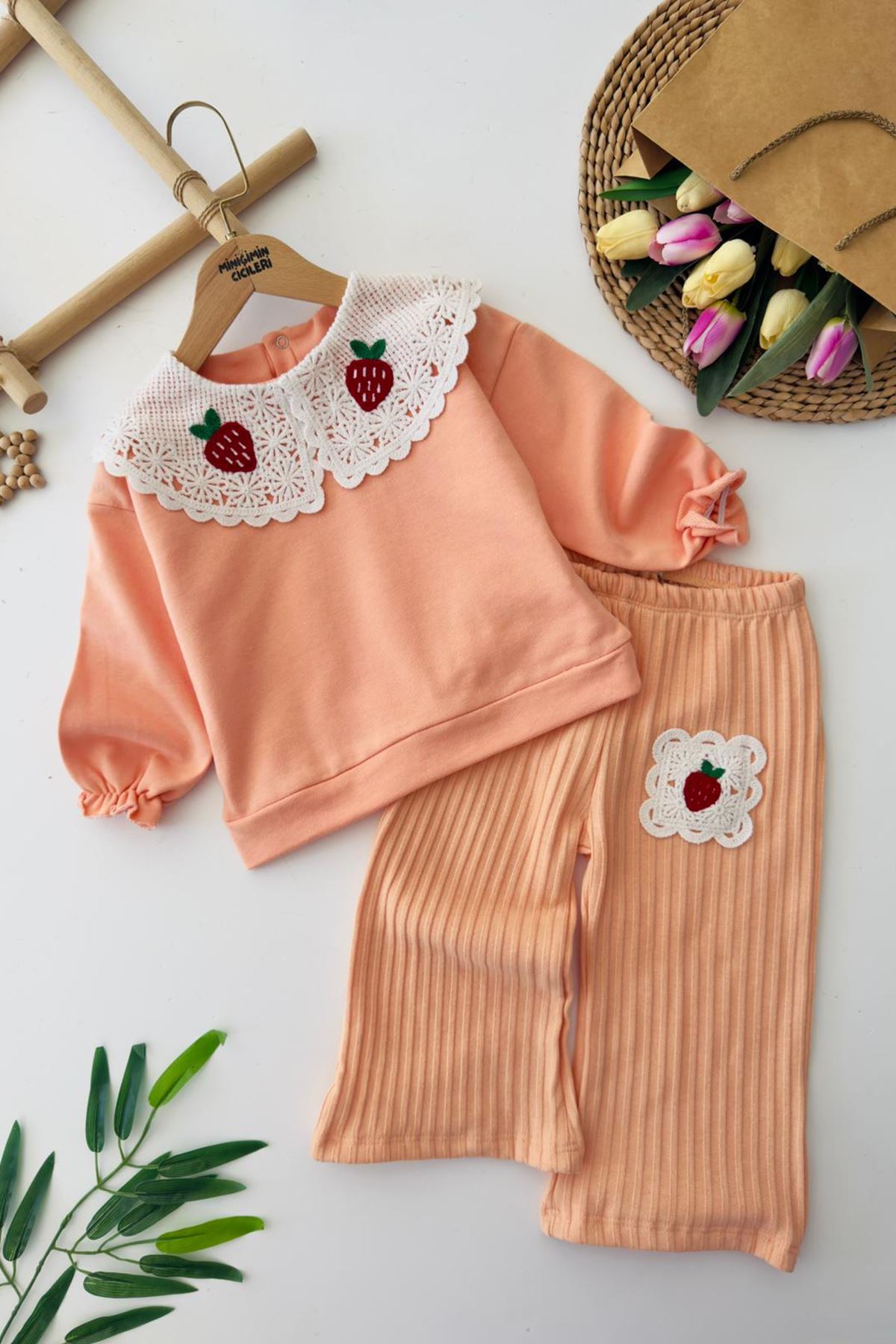 🌸 Miniğimin Cicileri Yaka Dantel Çilek Detaylı Kız Çocuk Takım