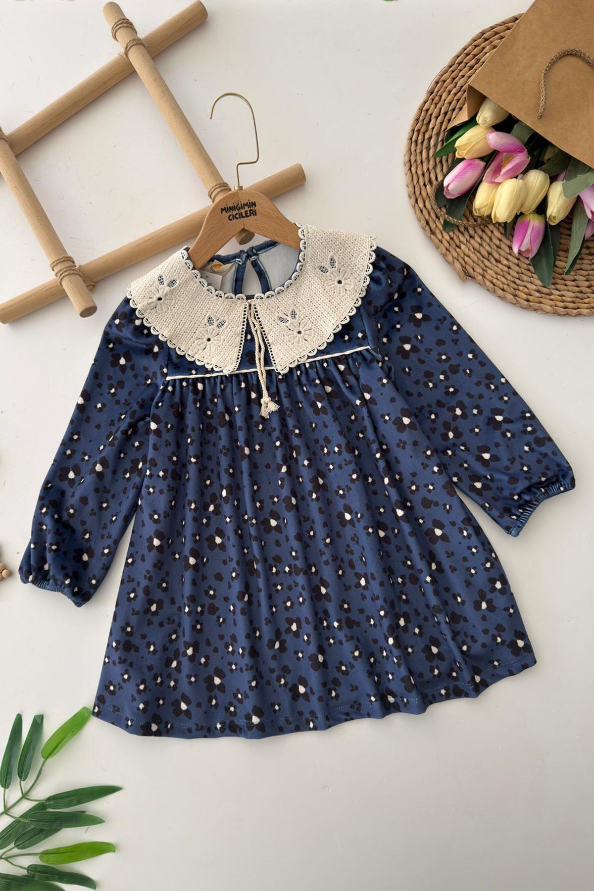 Miniğimin Cicileri Yaka Dantel Detaylo Leopar Kadife Kız Elbise - Mavi
