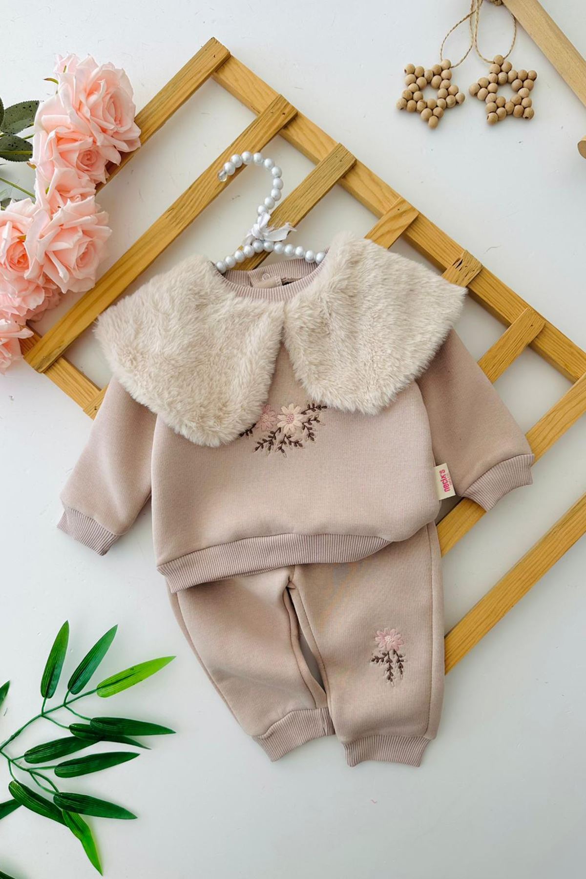 Sevimli kürk yakası, çiçek işlemeleri ve yumuşacık kumaşıyla bu takım, miniklerin kış boyunca sıcacık ve şık görünmesini sağlar. Konforlu, zarif ve kullanışlı bir seçim! 🌸✨