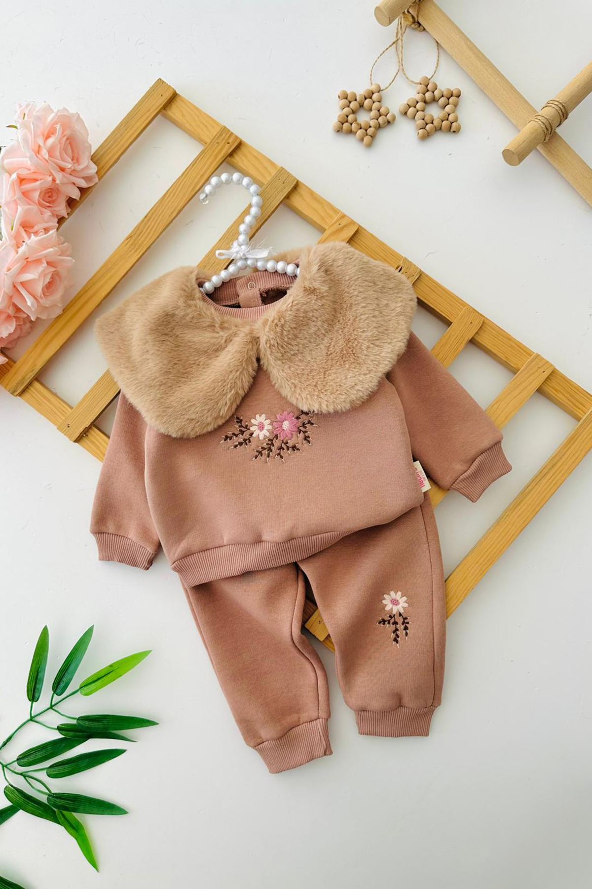 🌸 Yaka Kürk Detaylı Çiçek İşleme Kız Bebe Kışlık Takım – 3 İp Şardonlu Kumaş