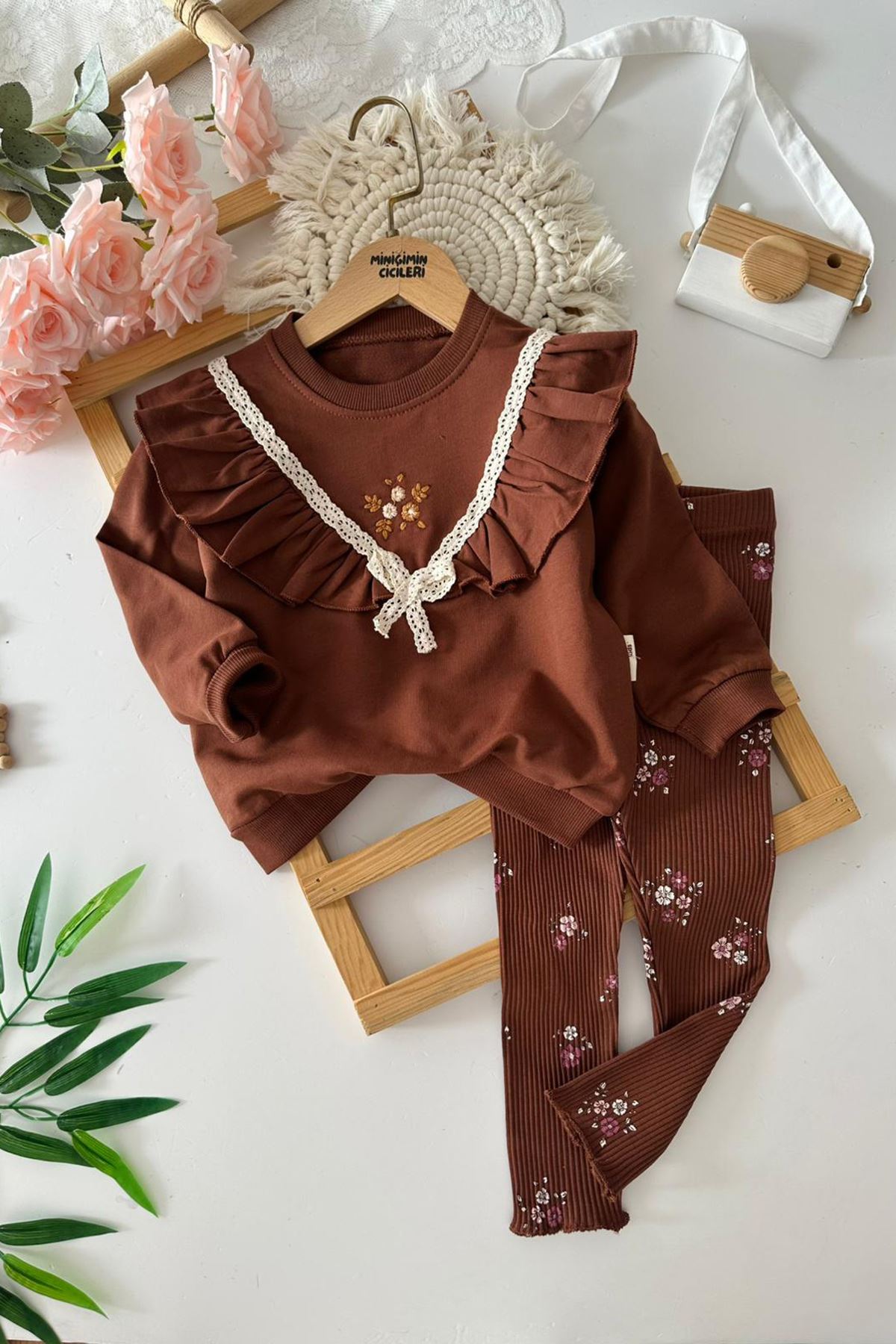 ✨ Ürün Özellikleri: ✔️ Volanlı ve dantel şerit detaylı sweatshirt, şık ve zarif bir görünüm sağlar. ✔️ Çiçek işlemeleri ile tatlı ve estetik bir tasarım sunar. ✔️ Üst parça 2 ip kumaştan üretilmiştir, mevsimlik kullanıma uygundur. ✔️ Alt tayt likralı fitilli penye, esnek yapısı sayesinde rahat hareket imkânı sağlar. ✔️ Günlük kullanımda ve özel günlerde şık ve konforlu kombin imkanı verir.