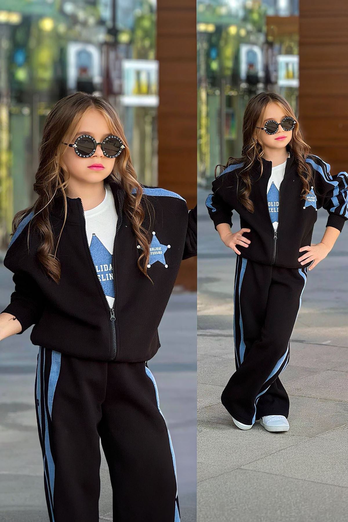 Miniğimin Cicileri Yıldız Desenli Fermuarlı Şeritli Kışlık 3 lü Kız Çocuk Takım - Siyah
