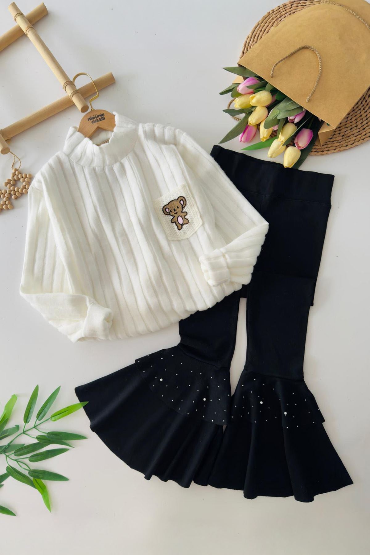 👗 Ürün Özellikleri: 🧵 Kadifemsi yumoş kumaştan üretilmiştir; sıcak tutar ve teni nazikçe sarar. 🐻 Cep kısmındaki örgü ayıcık motifi, tasarıma eğlenceli bir dokunuş katar. 👖 Taş detaylı ispanyol paça pantolon, modern ve zarif bir görünüm sağlar. 🎀 Esnek ve rahat kalıbı sayesinde gün boyu konfor sunar. 🌸 Günlük giyim, okul veya özel gün kombinleri için mükemmel bir tercihtir.
