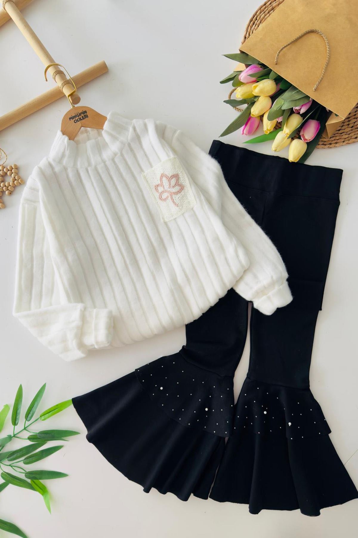 Miniğimin Cicileri Yumoş Cep Yaprak Örgü Detaylı Kız Çocuk İspanyol Takım - Beyaz