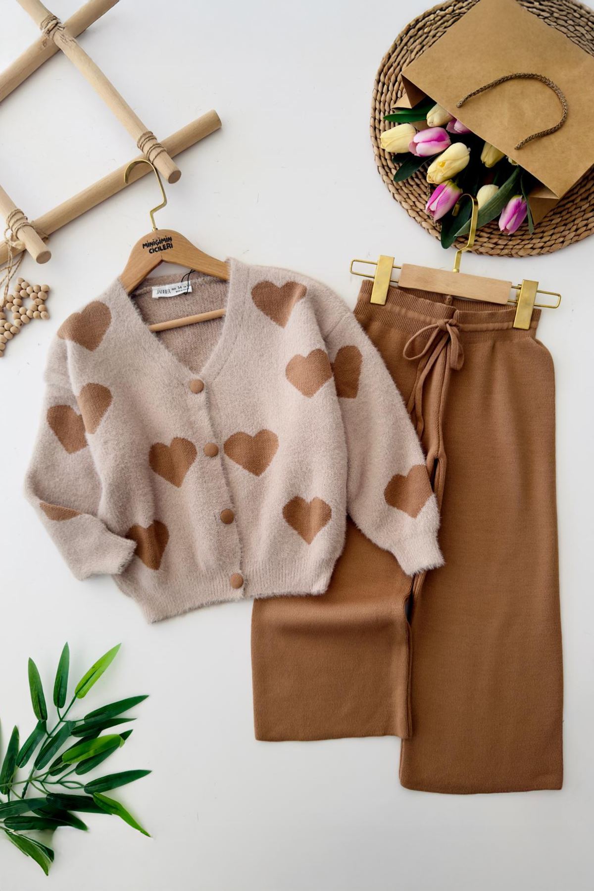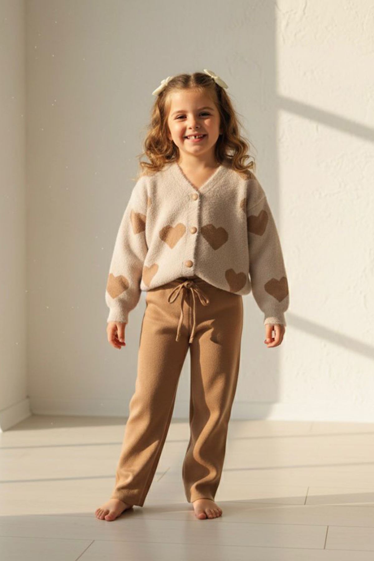 🌸 Yumoş Kalp Desenli Kız Çocuk Hırkalı Triko Takım