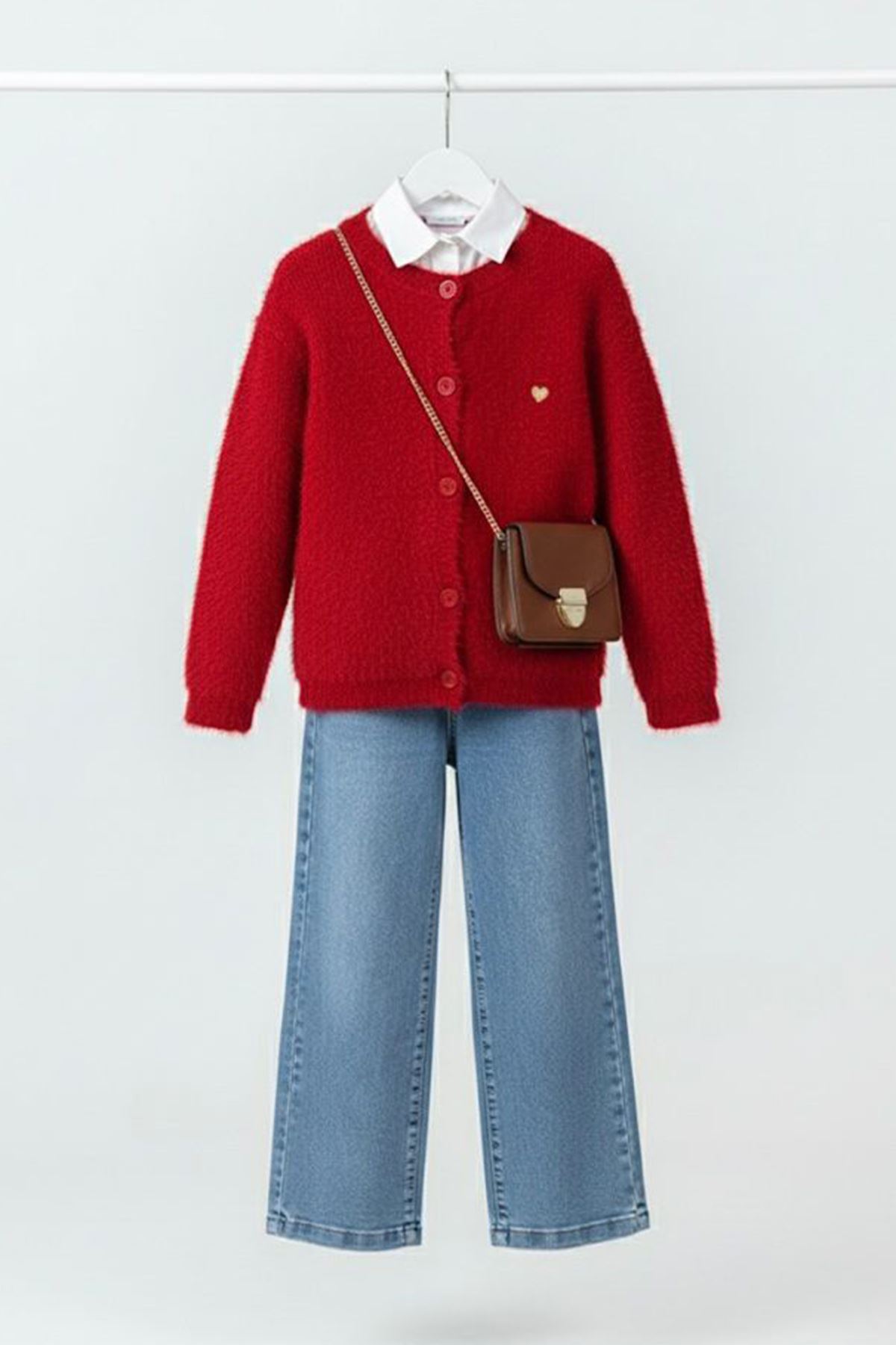 Modern kesimi ve sade şıklığıyla öne çıkan bu kombin, günlük stiline zarif dokunuşlar katmak isteyen minik hanımlar için tasarlandı. Konforlu jean pantolon ile yumuşak dokulu hırkanın uyumu, hem rahatlık hem de stil açısından ideal bir denge sunuyor.