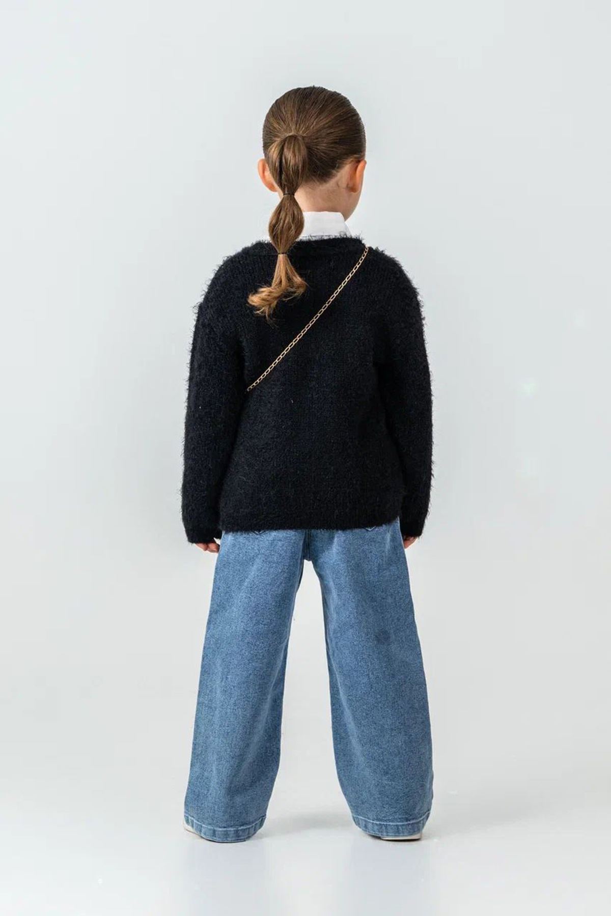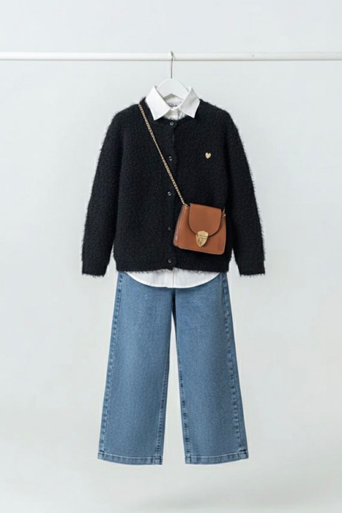 Miniğimin Cicileri Yumuşak Dokulu Kalp Detaylı Hırka ve Geniş Paça Jean Kız Çocuk Kombini - Siyah