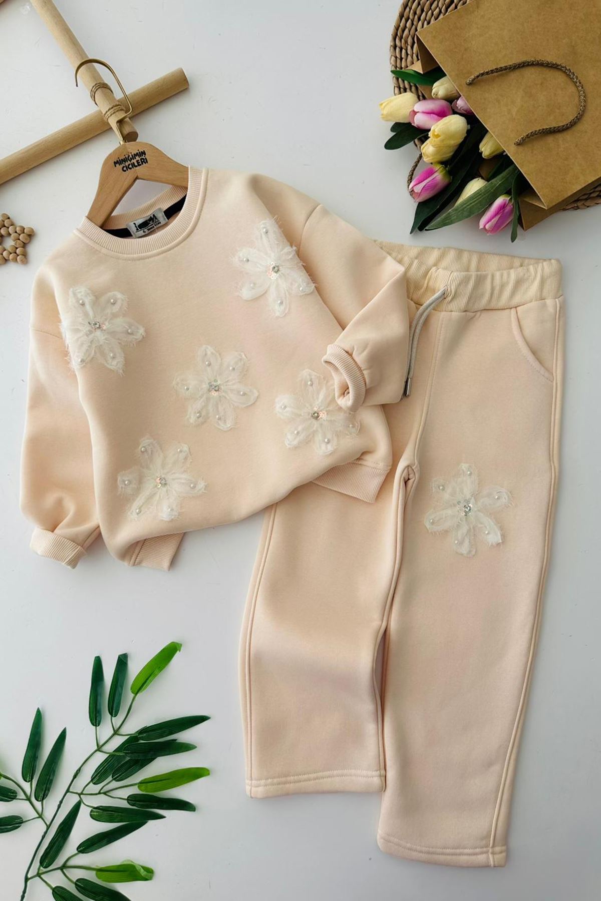 Miniğimin Cicileri Zambak Tül Detaylı Kışlık Kız Çocuk 2 li Takım - Krem