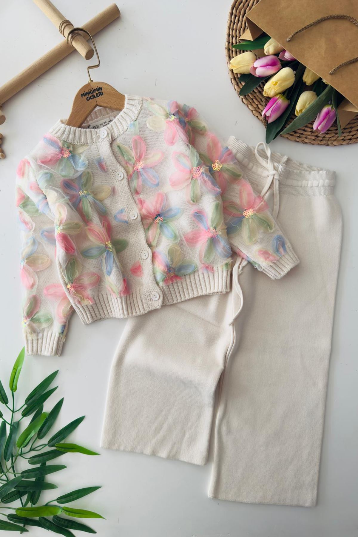 Pastel renklerin zarafetini tül çiçek detaylarıyla buluşturan bu takım, miniklerin bahar şıklığını tamamlıyor! 🌼💖