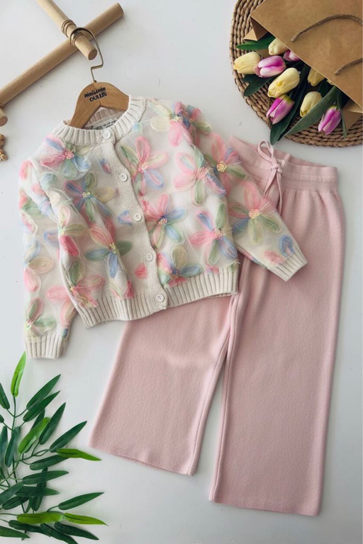 Pastel renklerin zarafetini tül çiçek detaylarıyla buluşturan bu takım, miniklerin bahar şıklığını tamamlıyor! 🌼💖