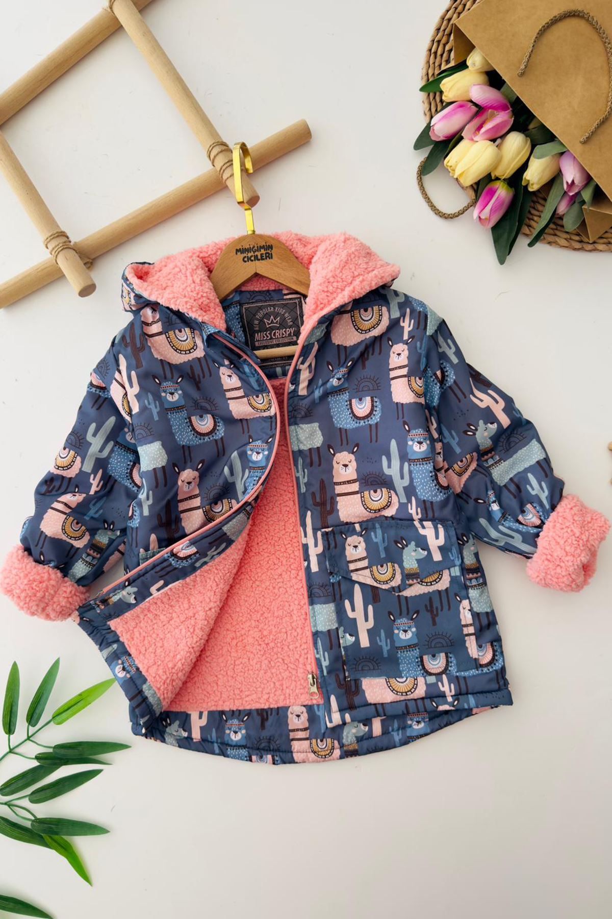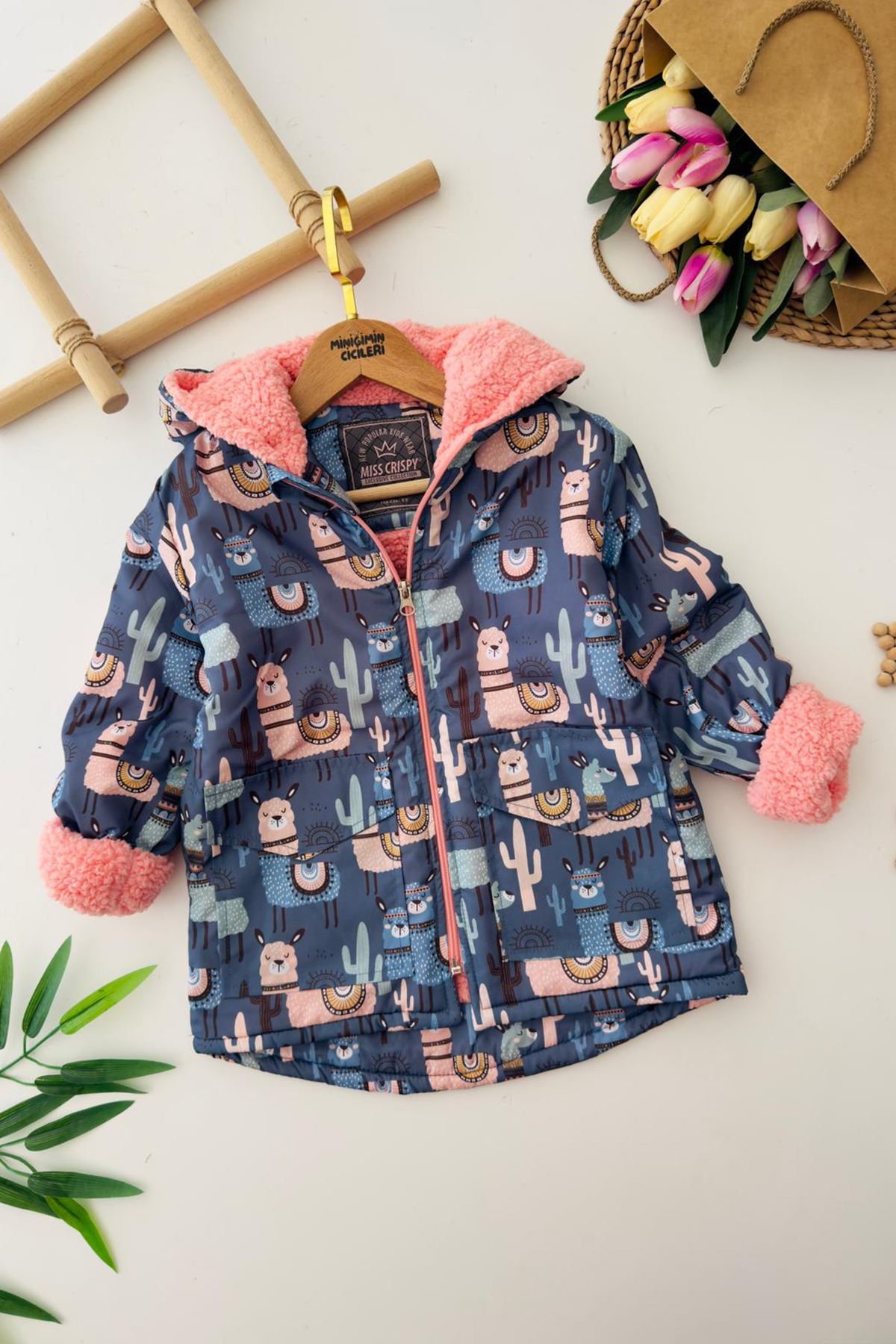 Miniğimin Cicilerin Lama Desenli Kapüşonlu Kız Çocuk Kürklü Kışlık Mont - Lacivert
