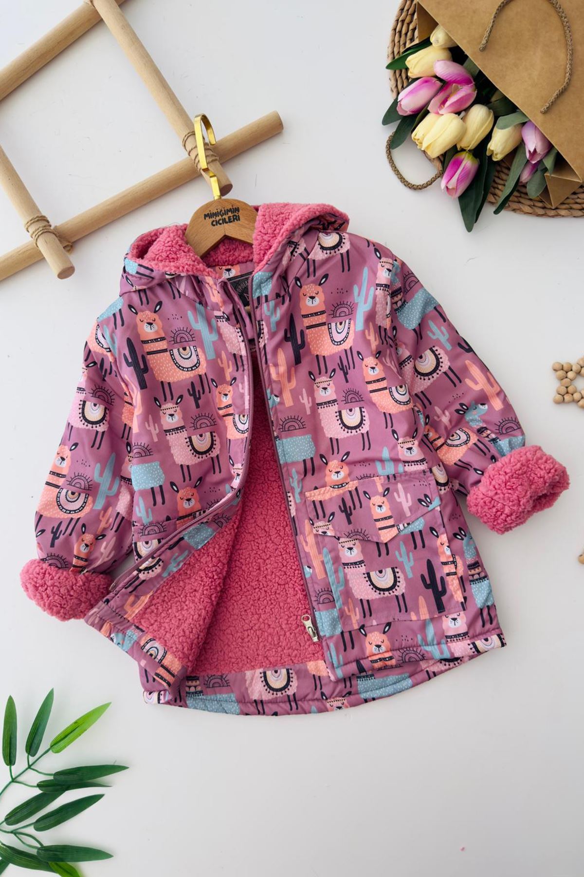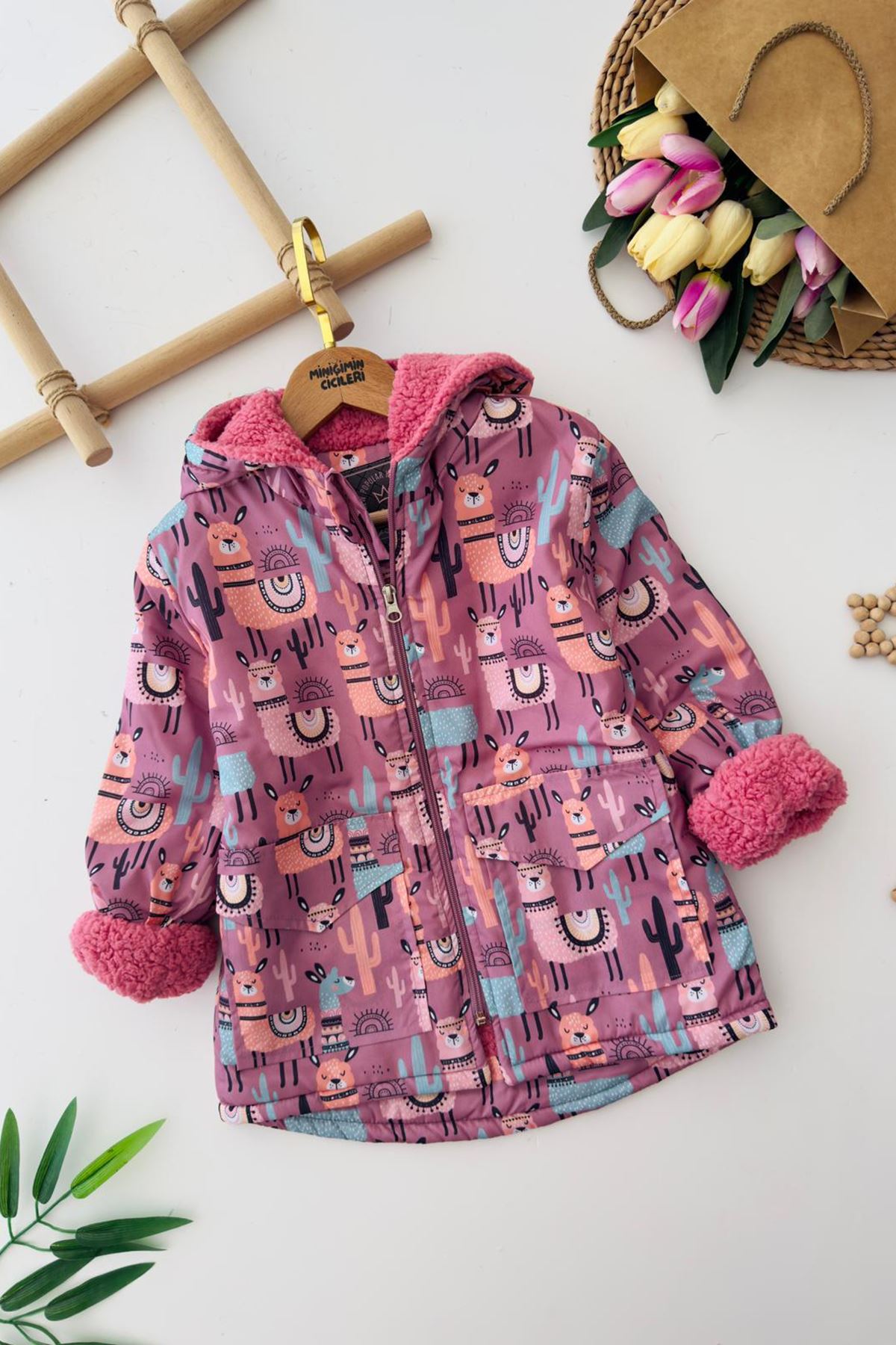 🌸 Miniğimin Cicileri Lama Desenli Kapüşonlu Kız Çocuk Kürklü Kışlık Mont
