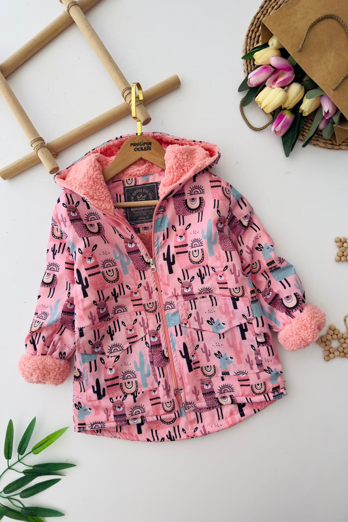 🌸 Miniğimin Cicileri Lama Desenli Kapüşonlu Kız Çocuk Kürklü Kışlık Mont